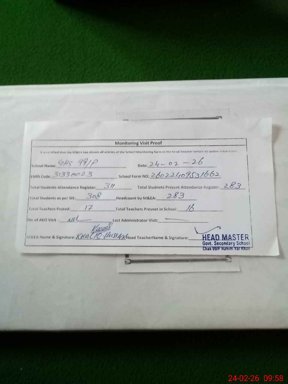 | Attendance Register | Head Teacher | MEA with School | Visit Proof |