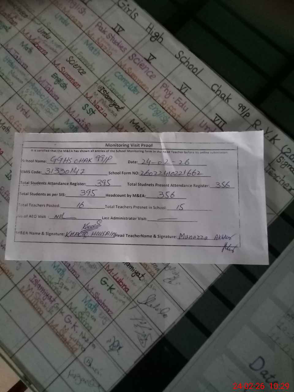 | EMIS Code: 31330147 | Name of School: GGHS CHAK NO. 99/P | |||