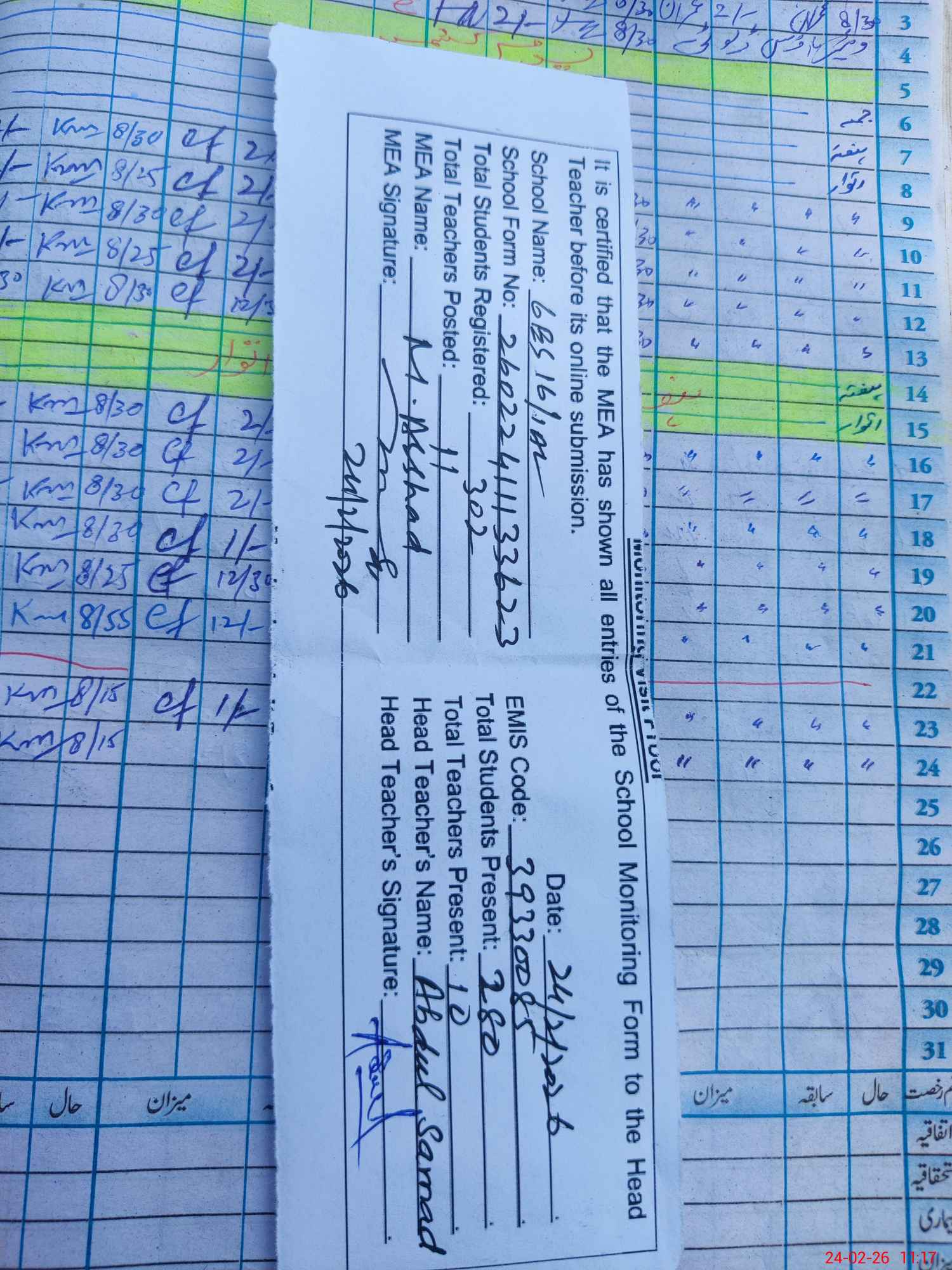 | Attendance Register | Head Teacher | MEA with School | Visit Proof |