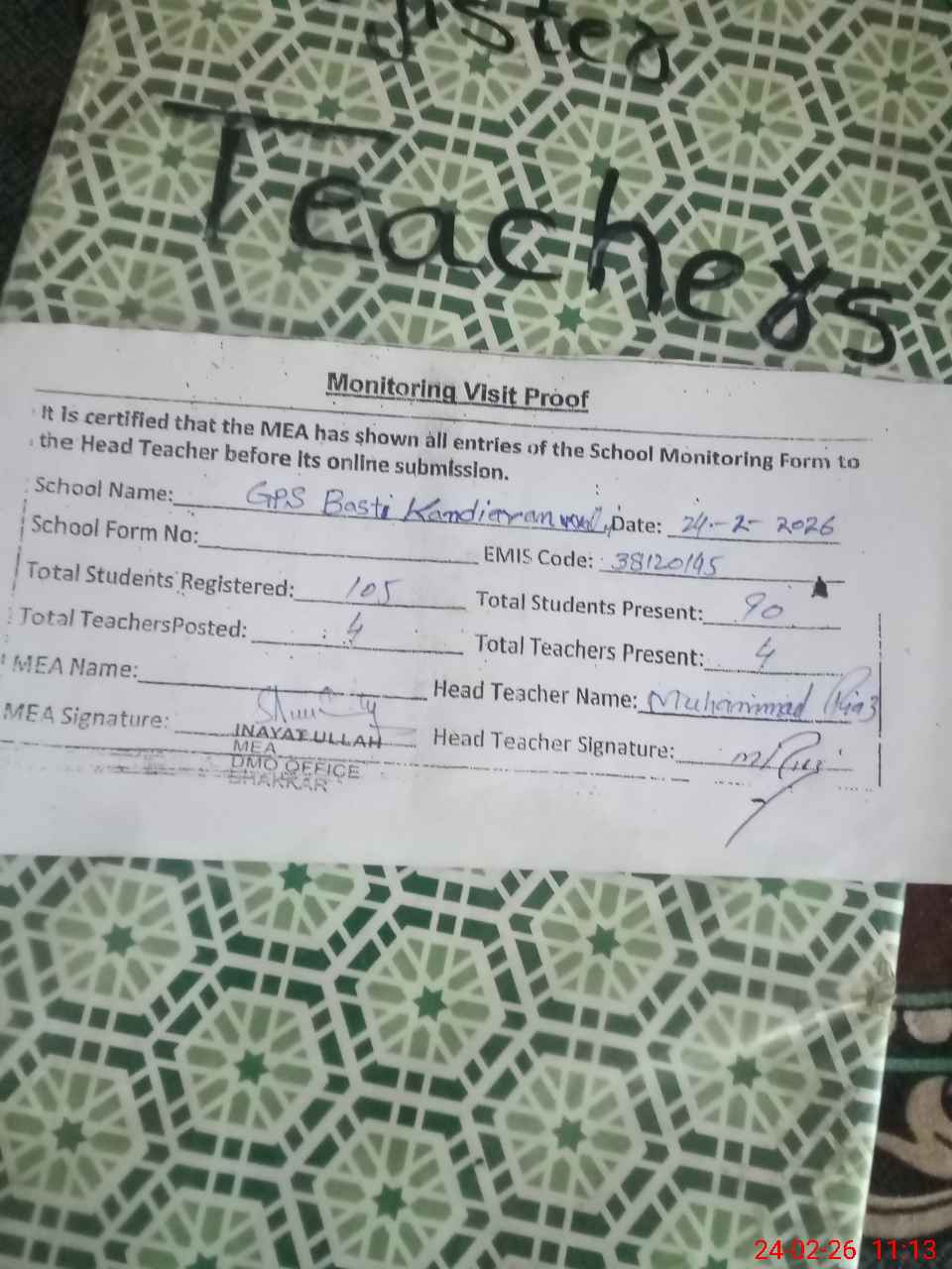 | Attendance Register | Head Teacher | MEA with School | Visit Proof |