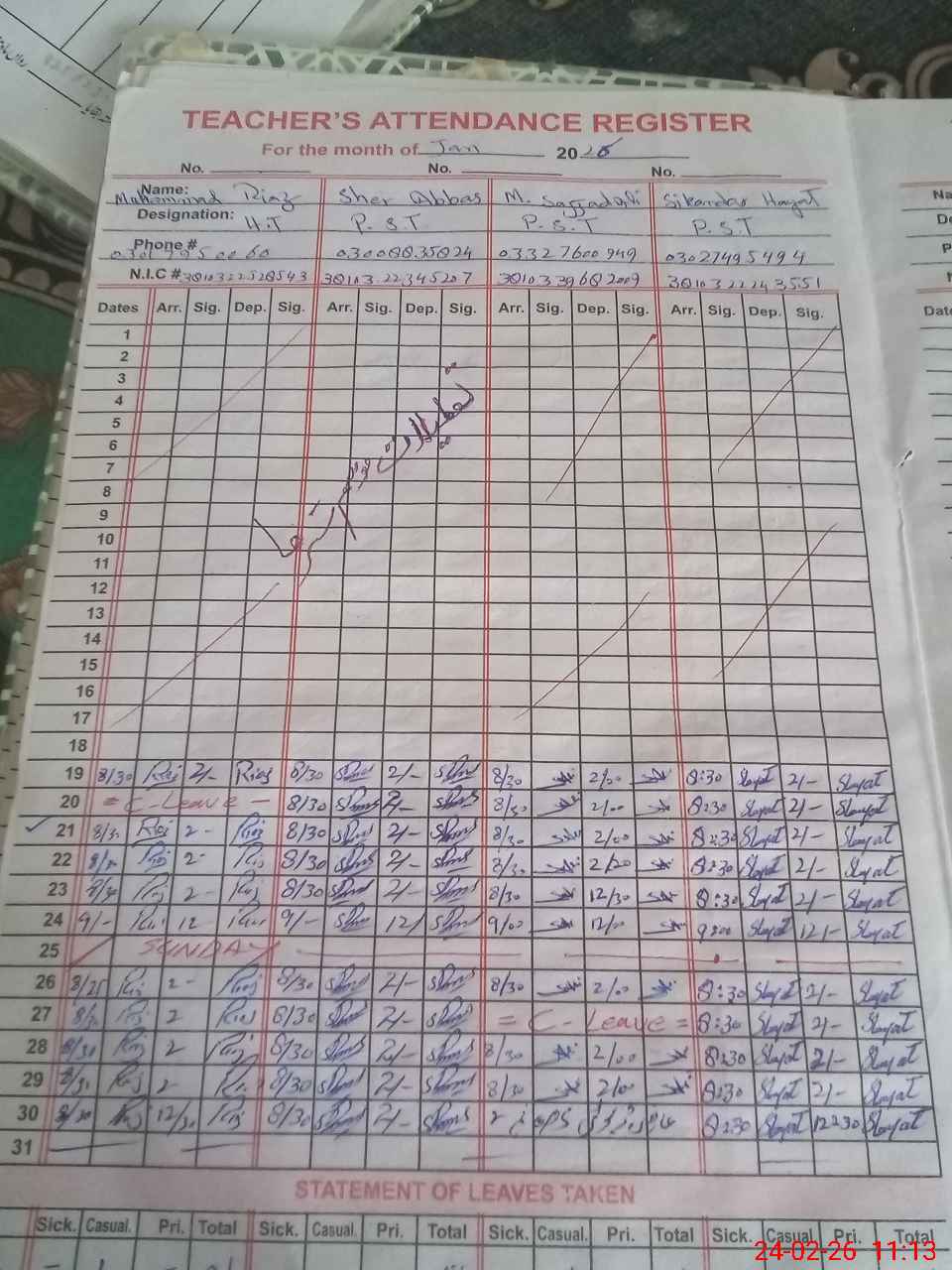 | CNIC | Full Name | Designation | R/C | Absence during last cal. month |