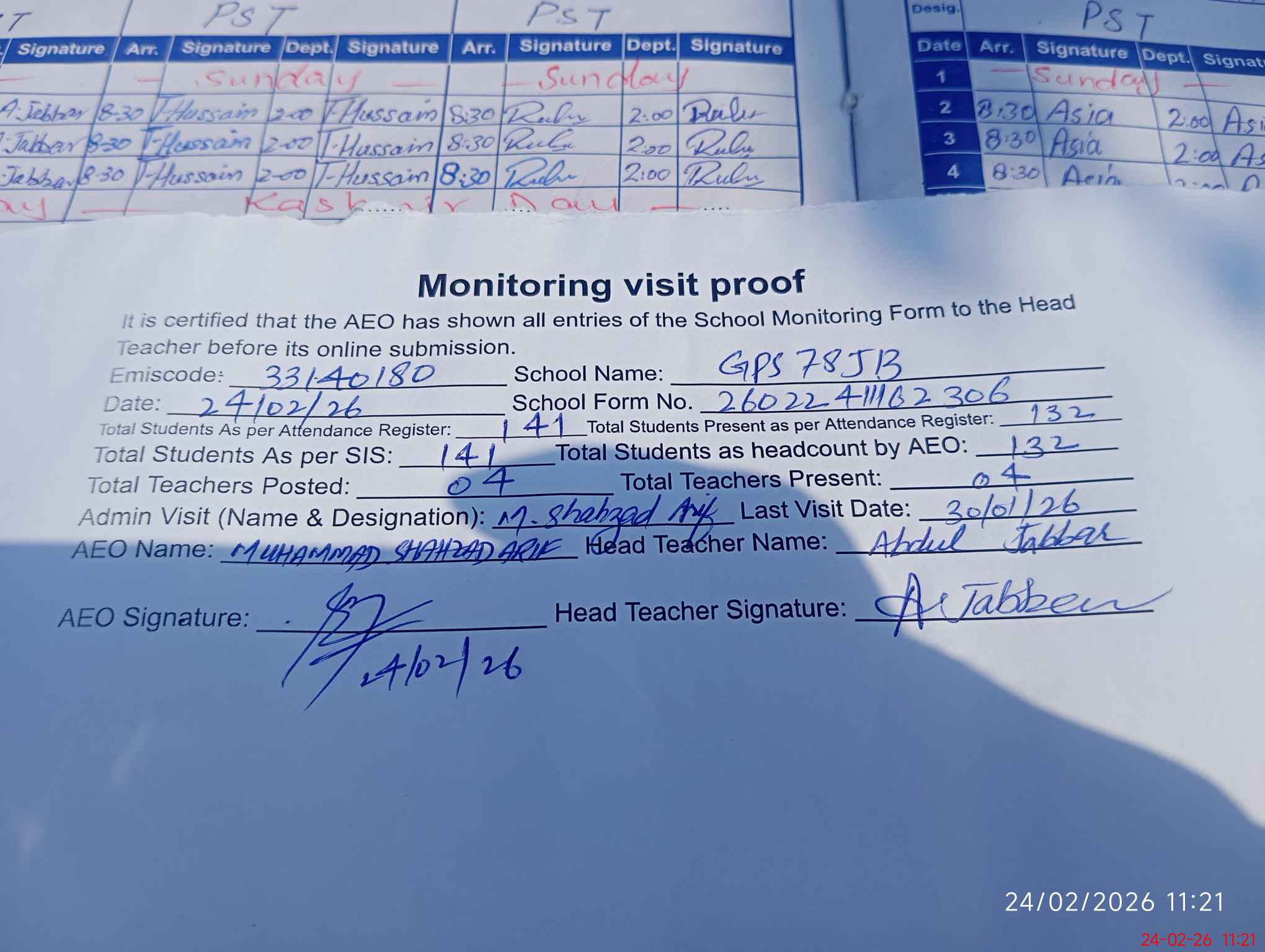 | Name: Ab**** Ja**** Designation: (School Headmaster's/Headmistress's) PST Phone/Cell Number: 03**** |