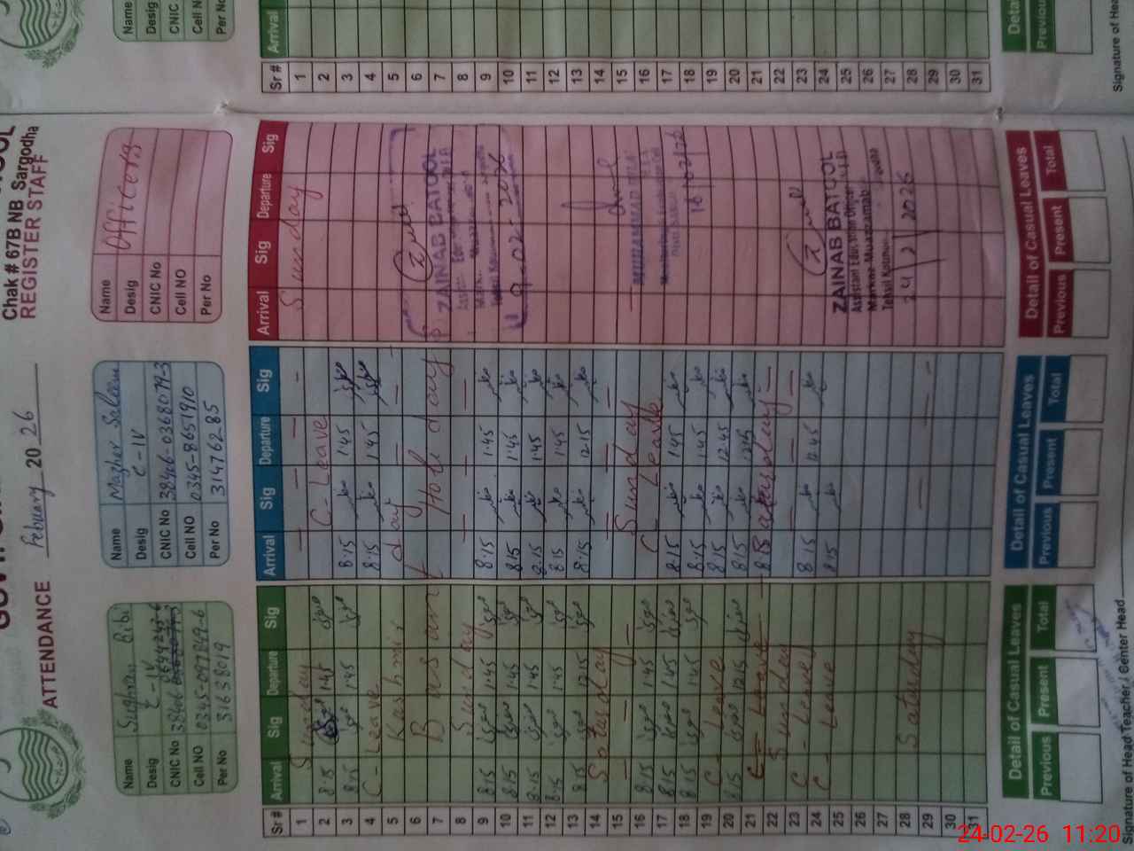 | CNIC | Full Name | Designation | R/C | Absence During Last Calender Month |