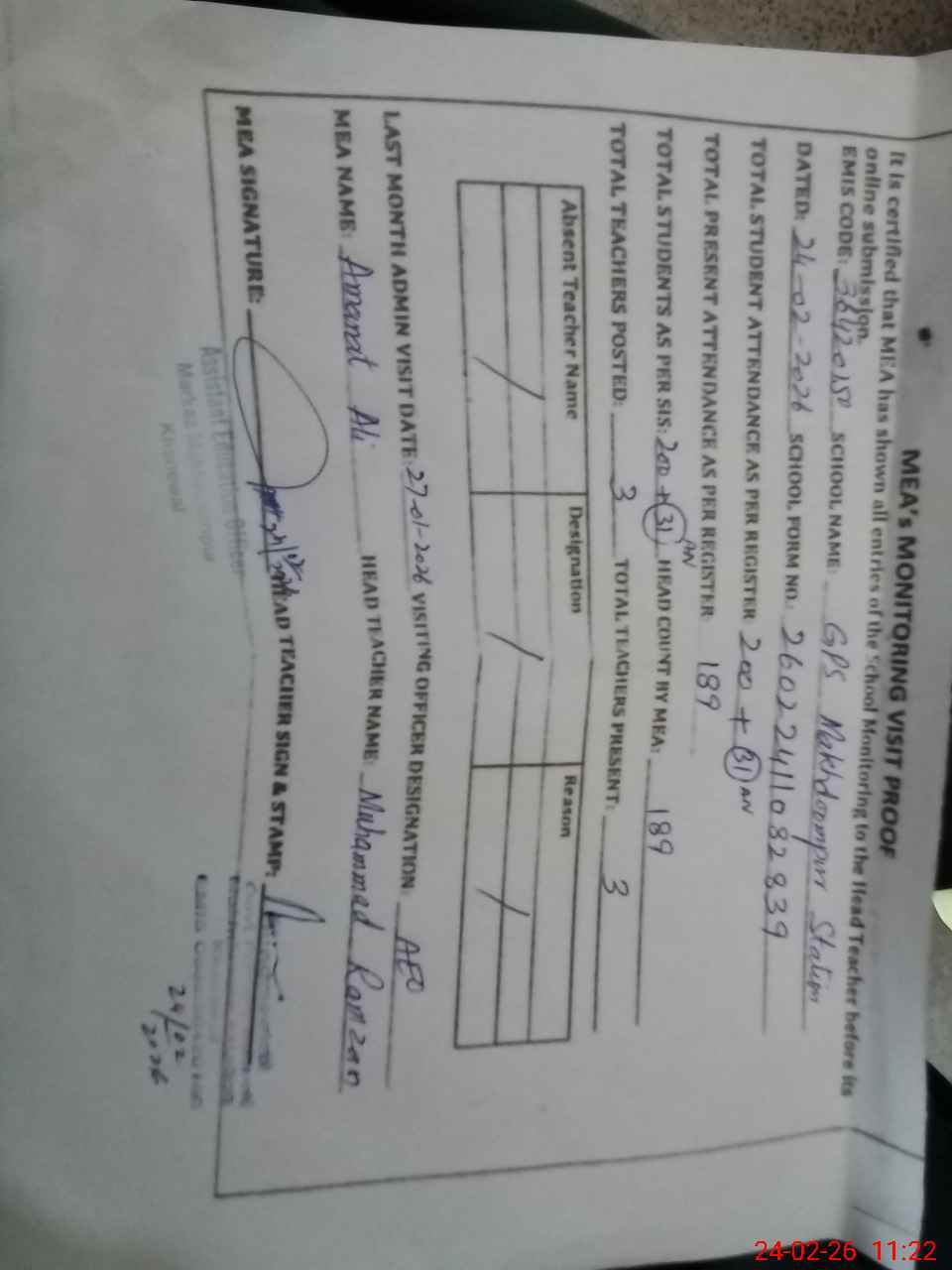 | Attendance Register | Head Teacher | MEA with School | Visit Proof |