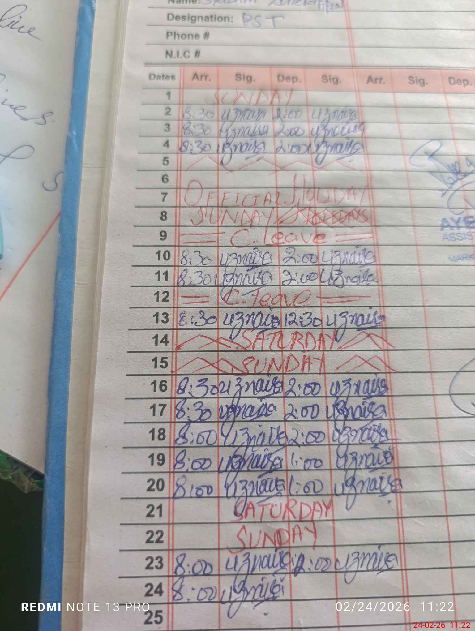 | CNIC | Full Name | Designation | R/C | Absence During Last Calender Month |