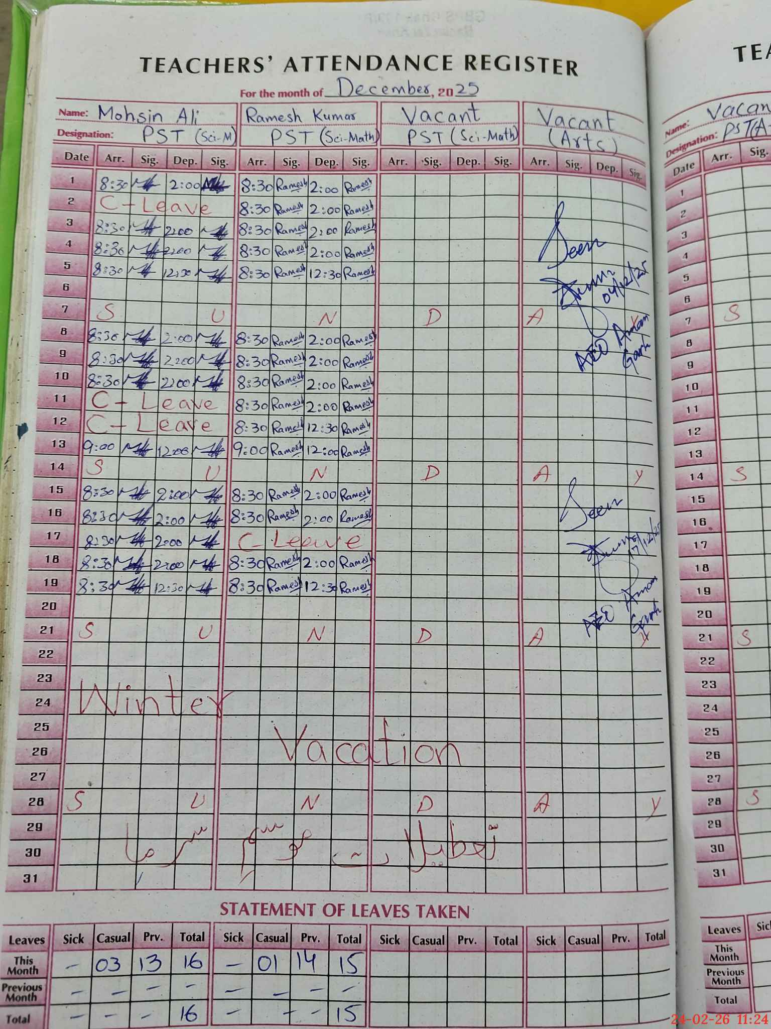 | Leave | Duty | Absent | Maternity | Medical | Ex- Pak |