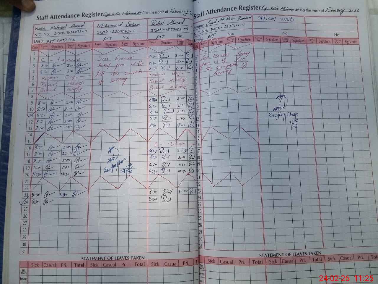 | CNIC | Full Name | Designation | R/C | Absence During Last Calender Month |