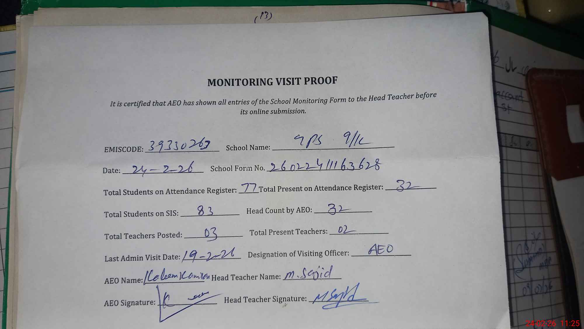 | Attendance Register | Head Teacher | MEA with School | Visit Proof |