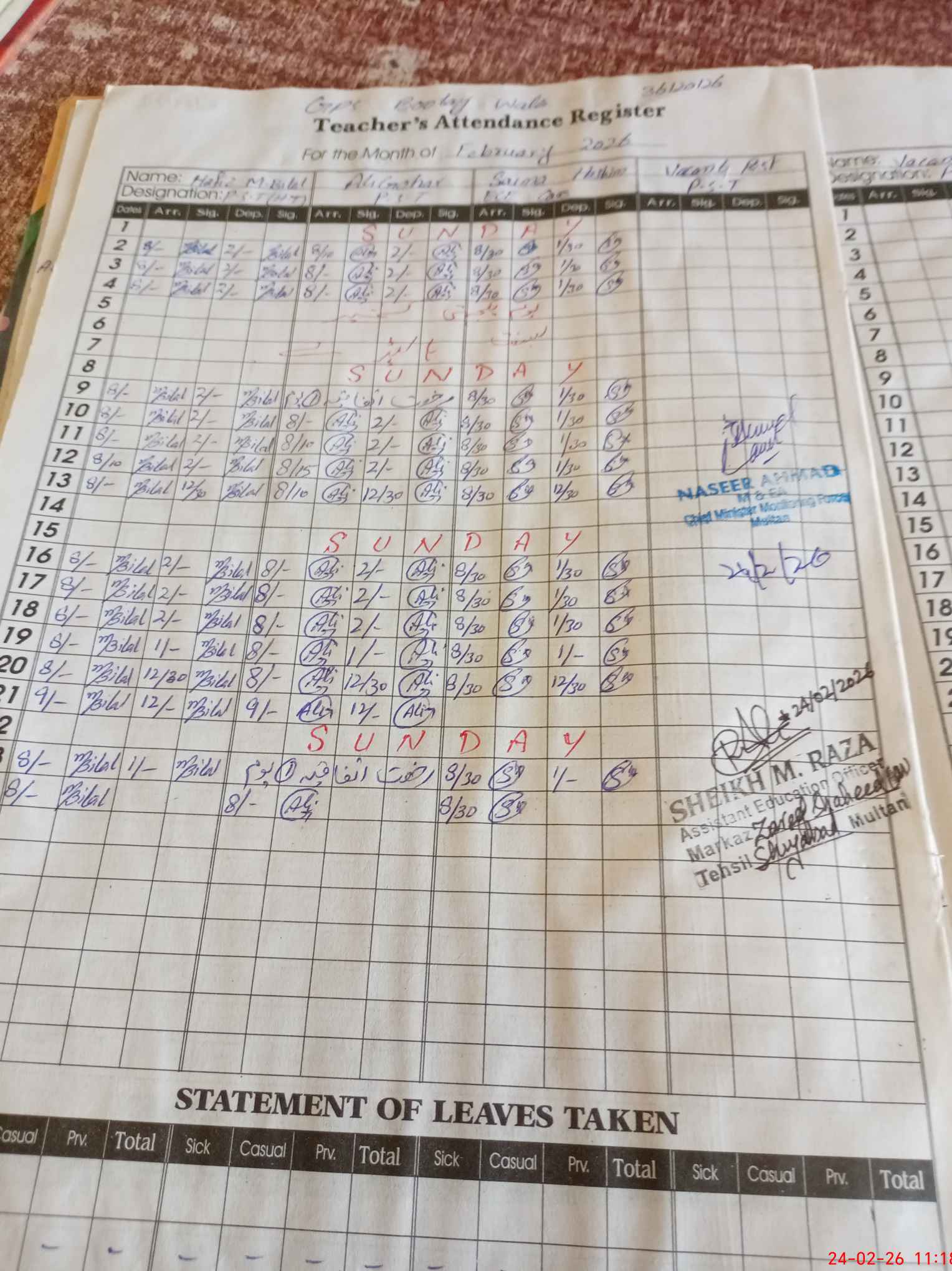| CNIC | Full Name | Designation | R/C | Absence During Last Calender Month |