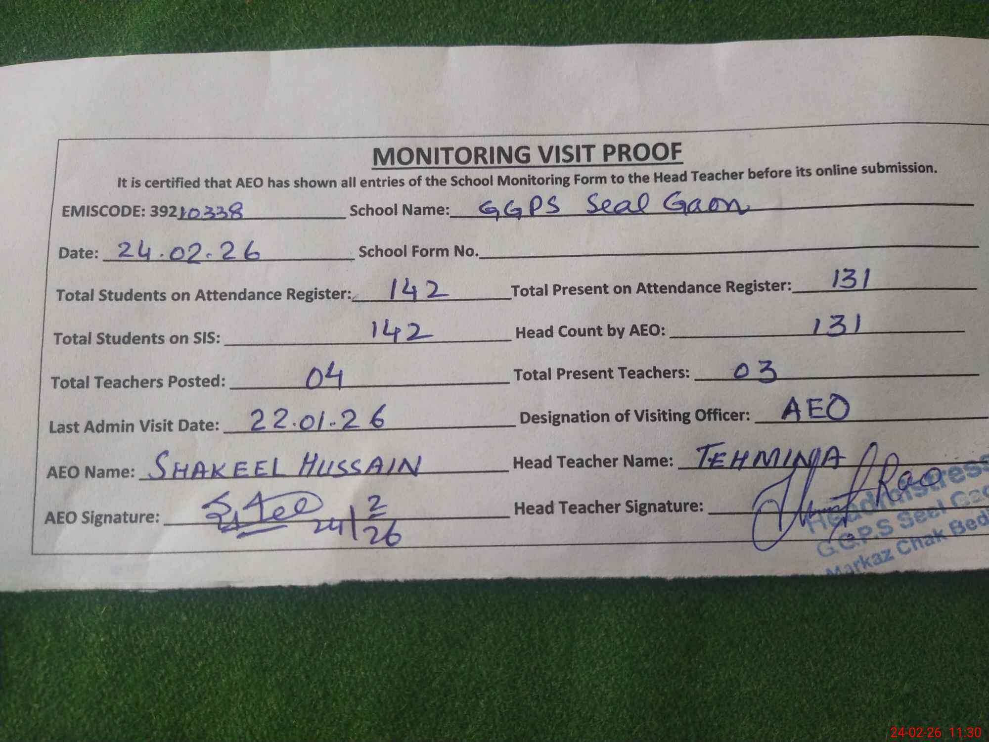 | Attendance Register | Head Teacher | MEA with School | Visit Proof |