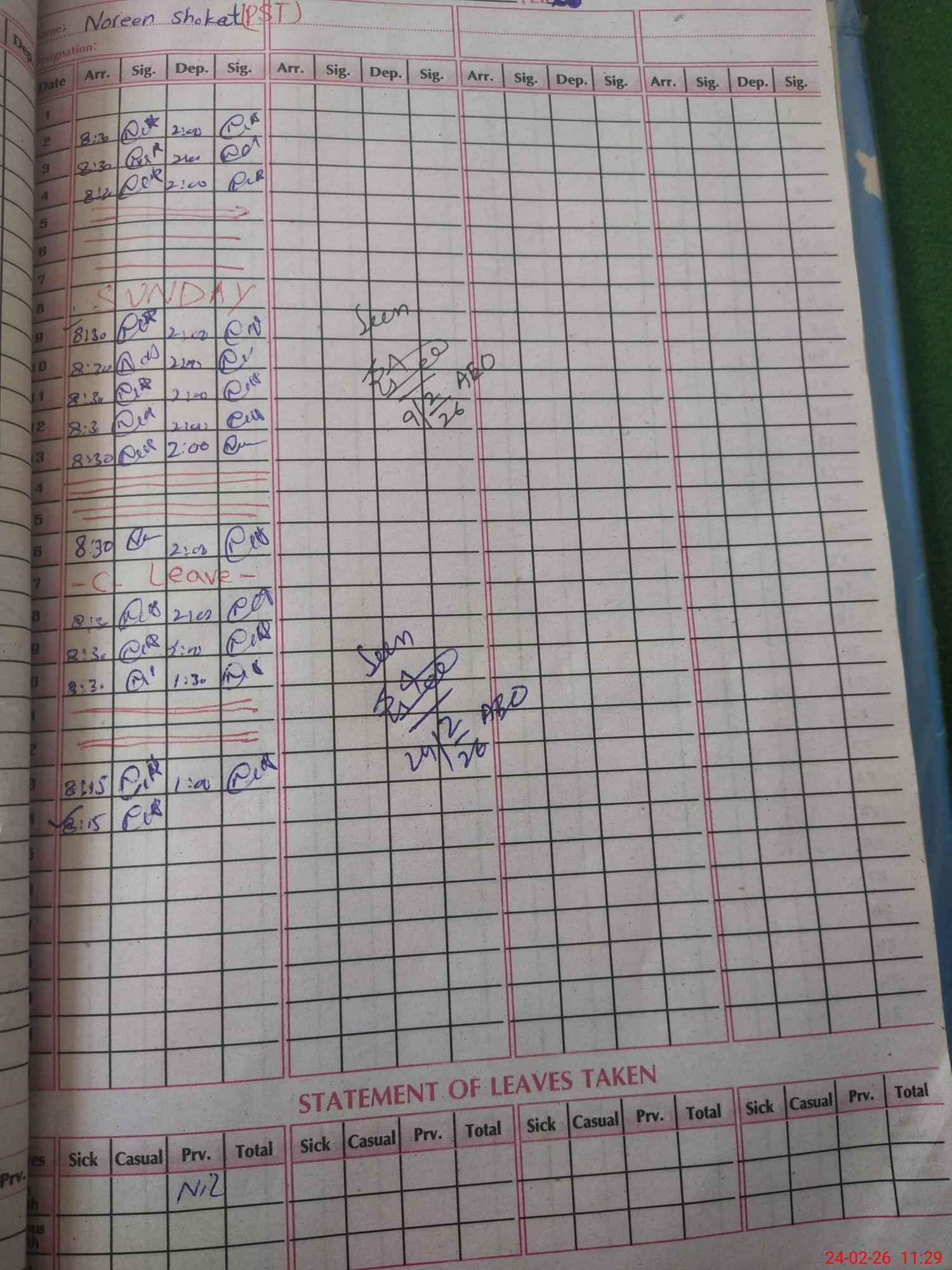 | CNIC | Full Name | Designation | R/C | Absence During Last Calender Month |