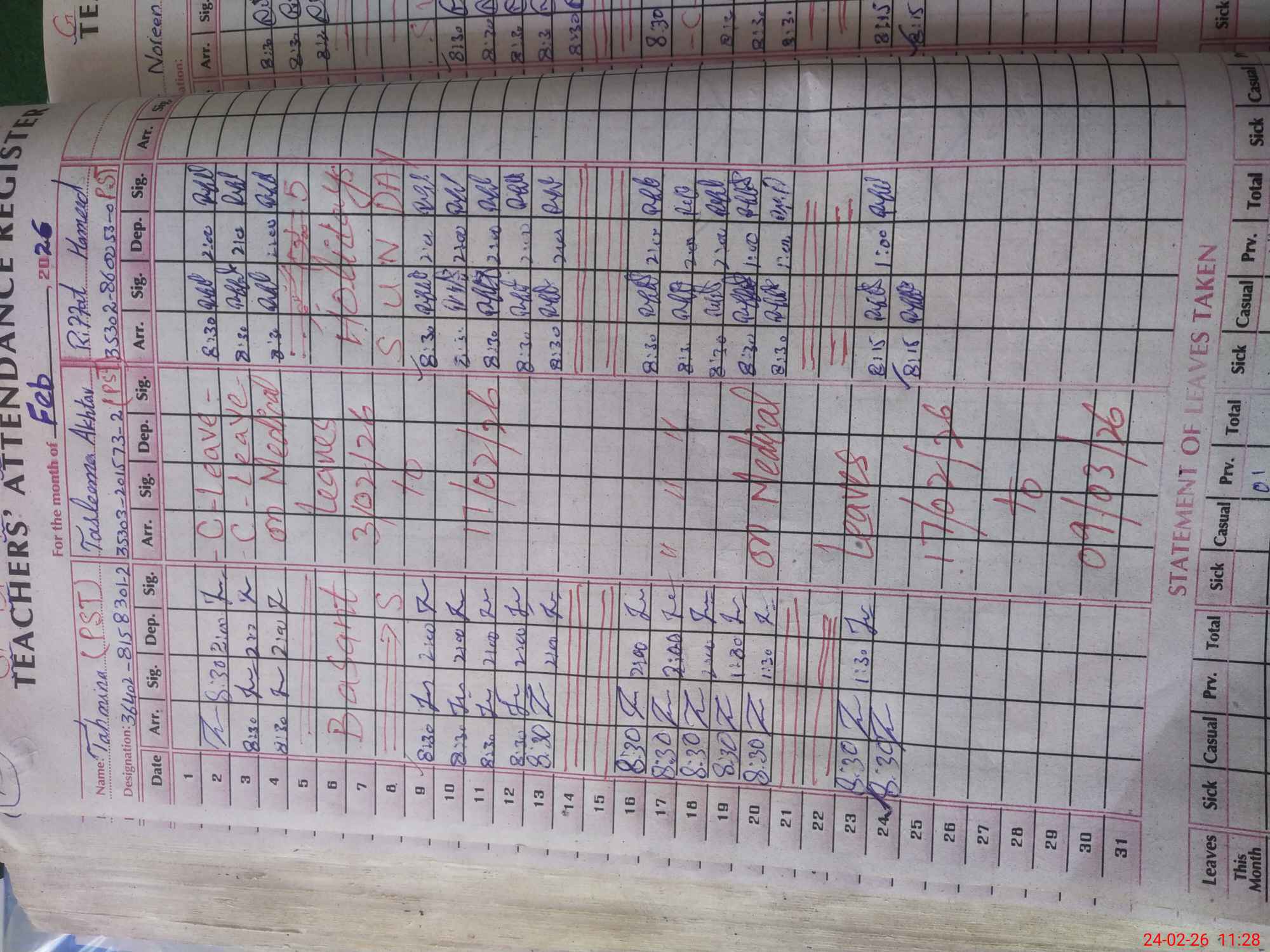 | Leave | Duty | Absent | Maternity | Medical | Ex- Pak |