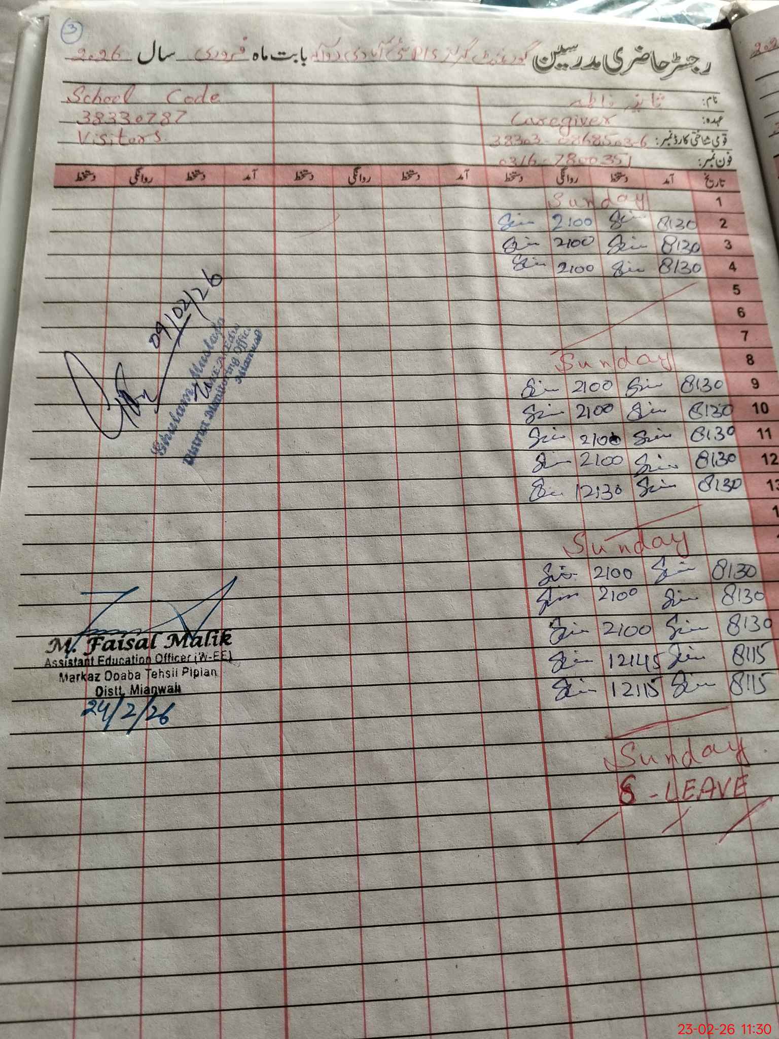 | Name: Sa**** As**** Designation: (School Headmaster's/Headmistress's) PST Phone/Cell Number: 03**** |