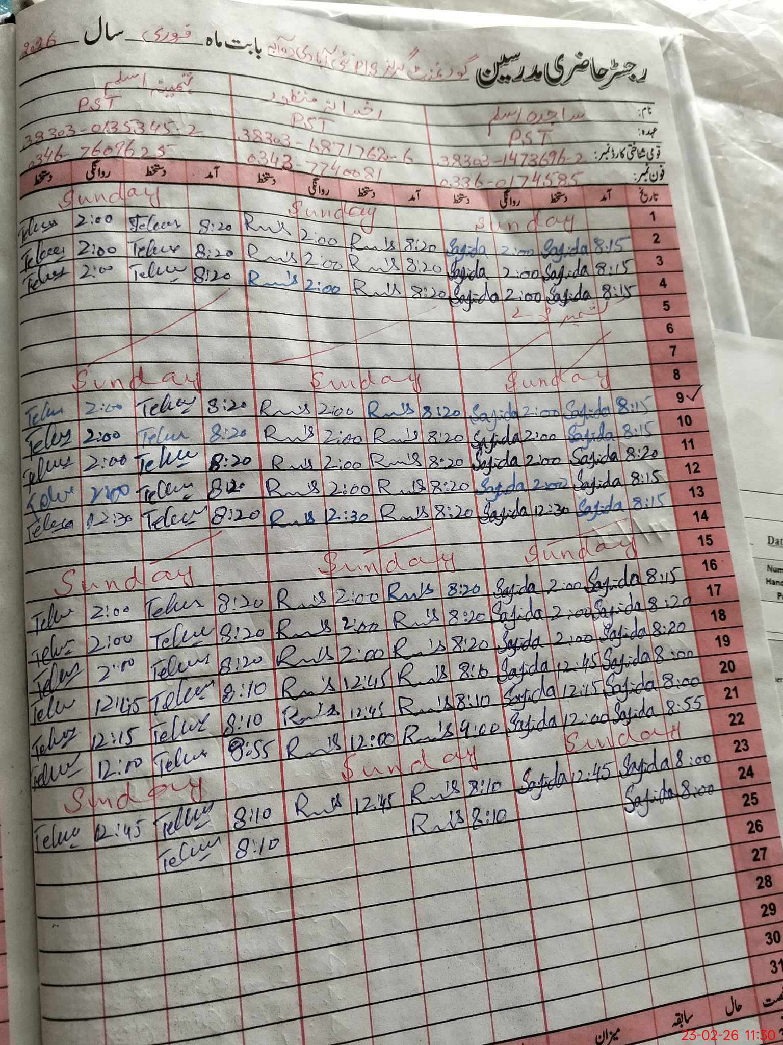 | CNIC | Full Name | Designation | R/C | Absence During Last Calender Month |