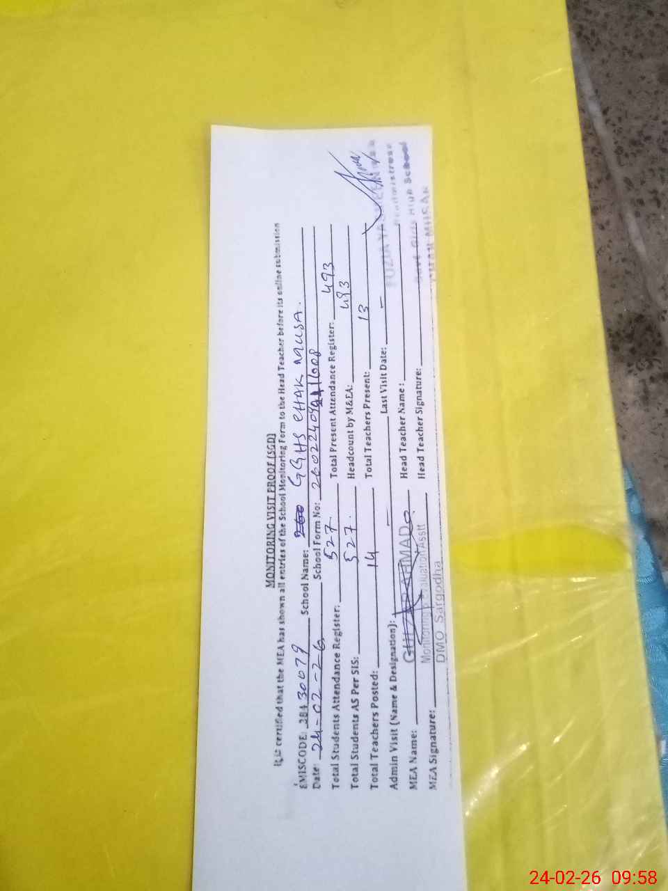 | Attendance Register | Head Teacher | MEA with School | Visit Proof |