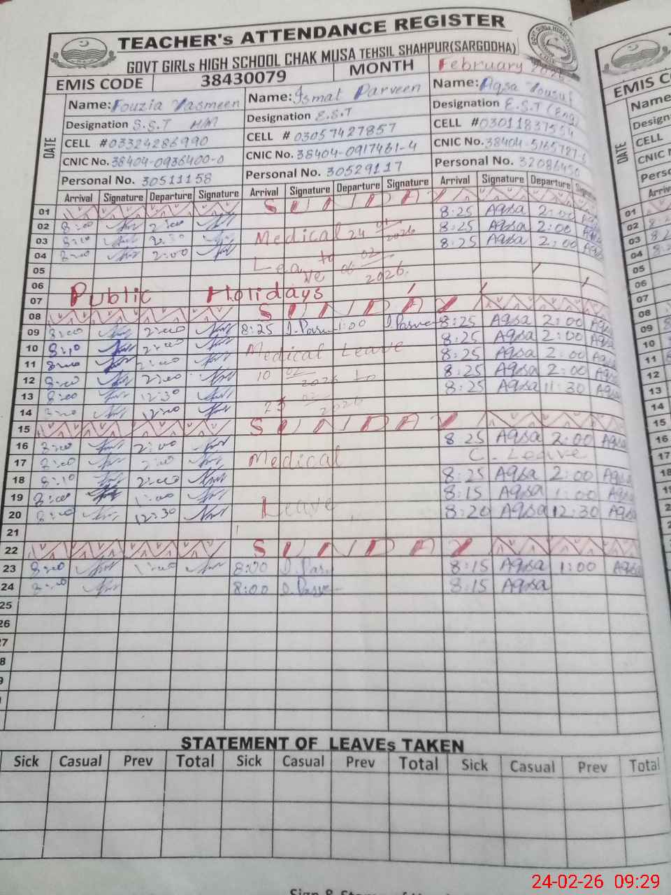 | CNIC | Full Name | Designation | R/C | Absence During Last Calender Month |