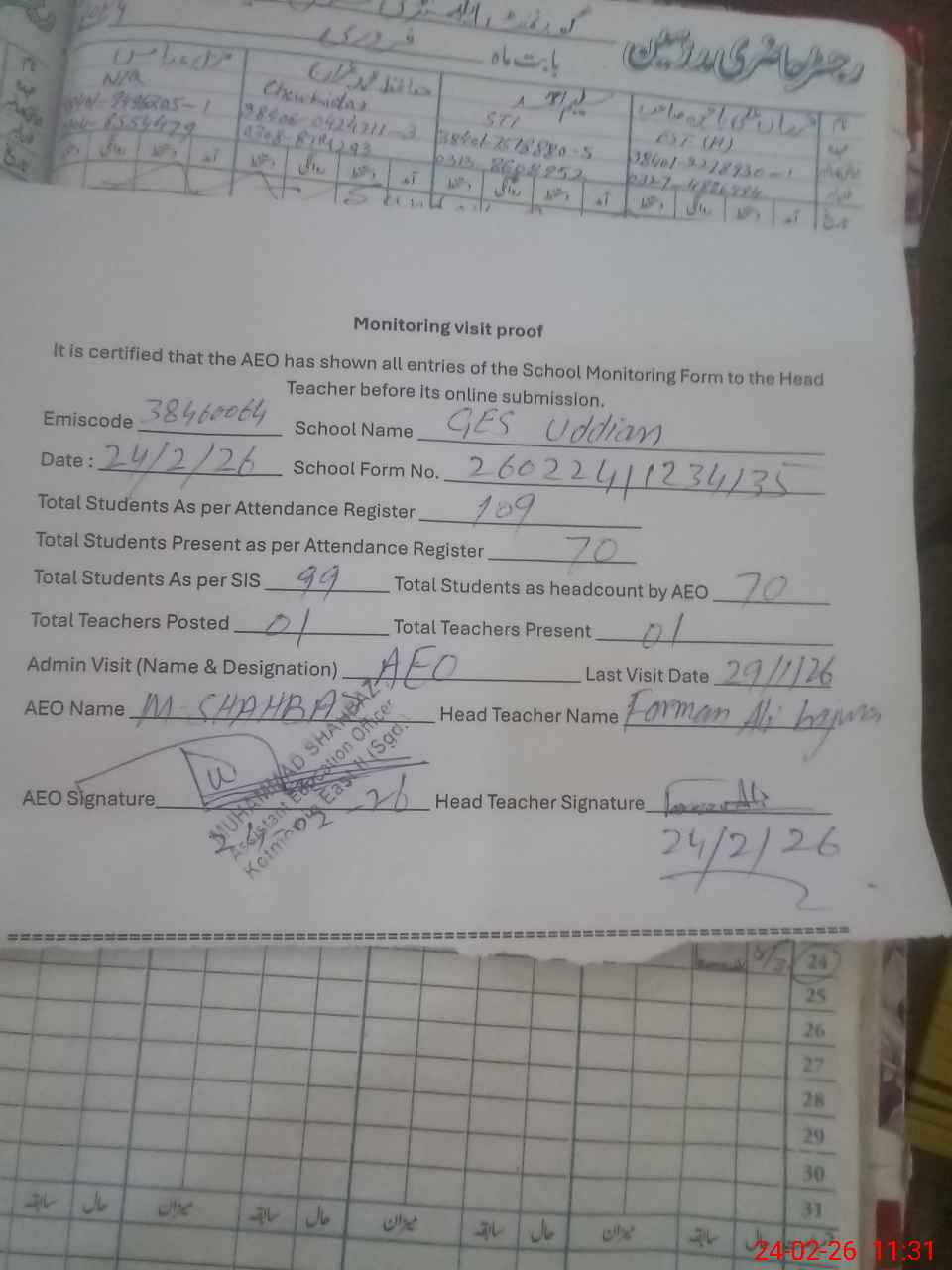 | Attendance Register | Head Teacher | MEA with School | Visit Proof |