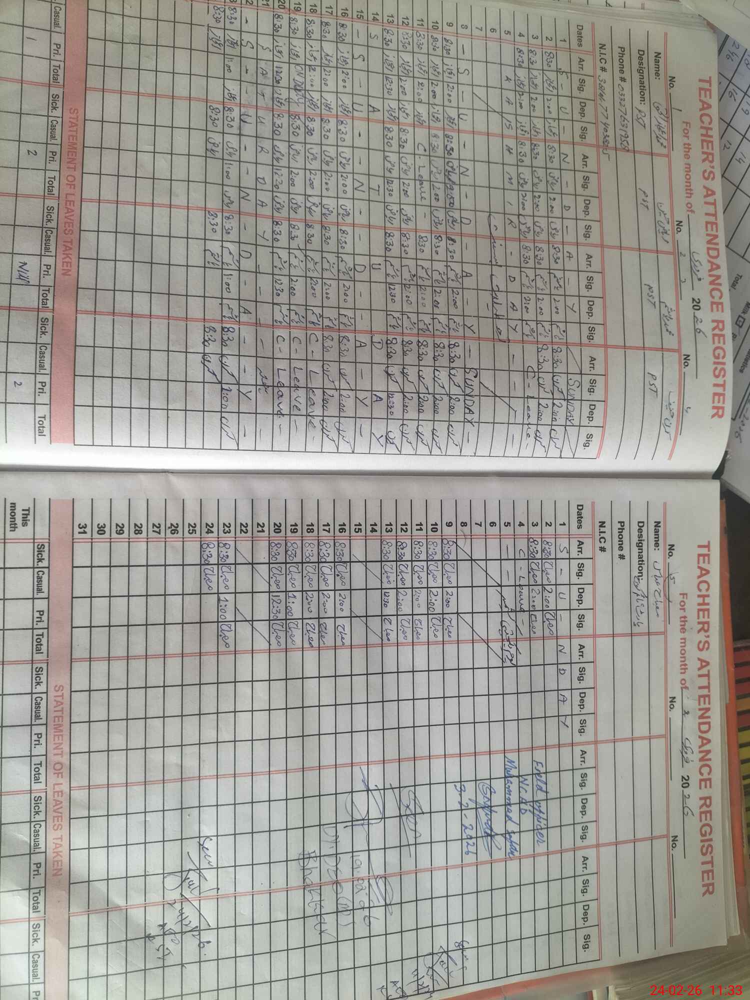 | CNIC | Full Name | Designation | R/C | Absence During Last Calender Month |