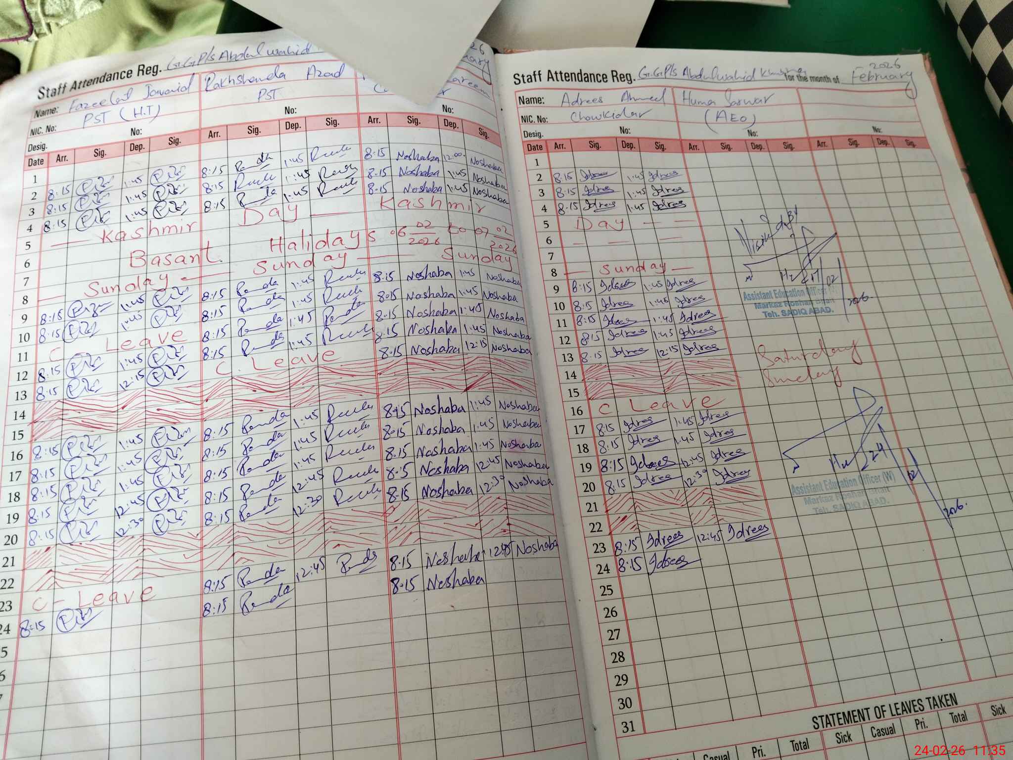 | CNIC | Full Name | Designation | R/C | Absence During Last Calender Month |