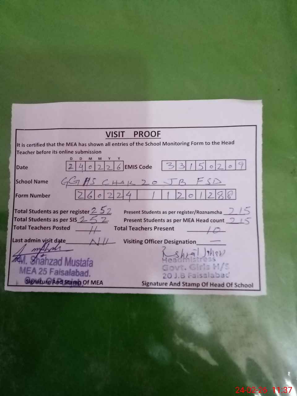 | EMIS Code: 33150209 | Name of School: GGHS CHAK NO. 20 JB | |||
