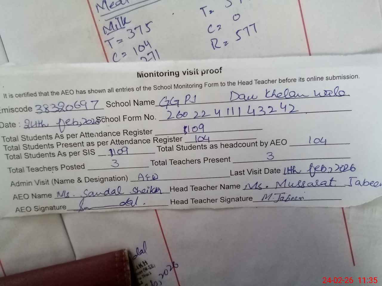 | Attendance Register | Head Teacher | MEA with School | Visit Proof |