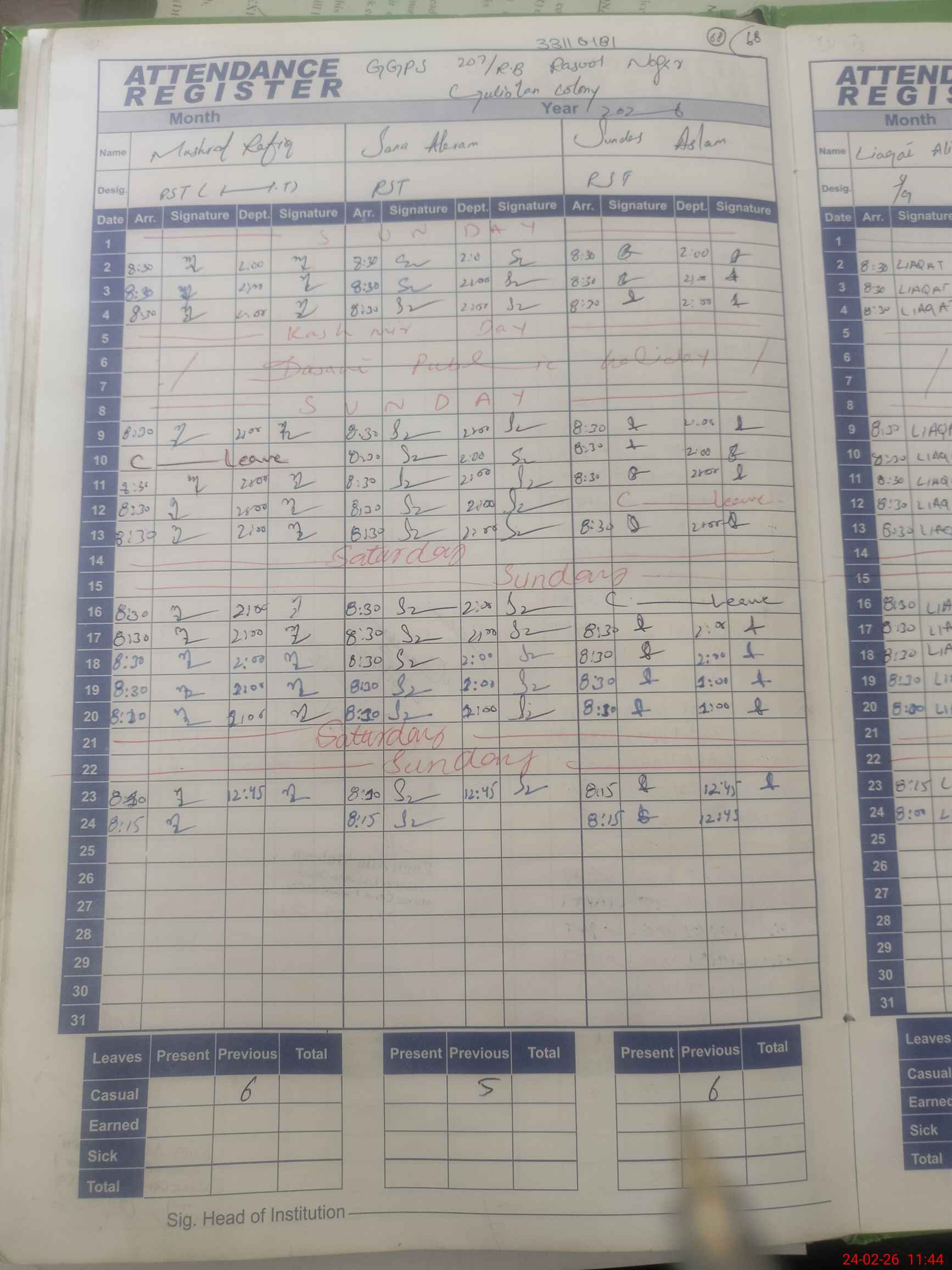| CNIC | Full Name | Designation | R/C | Absence During Last Calender Month |