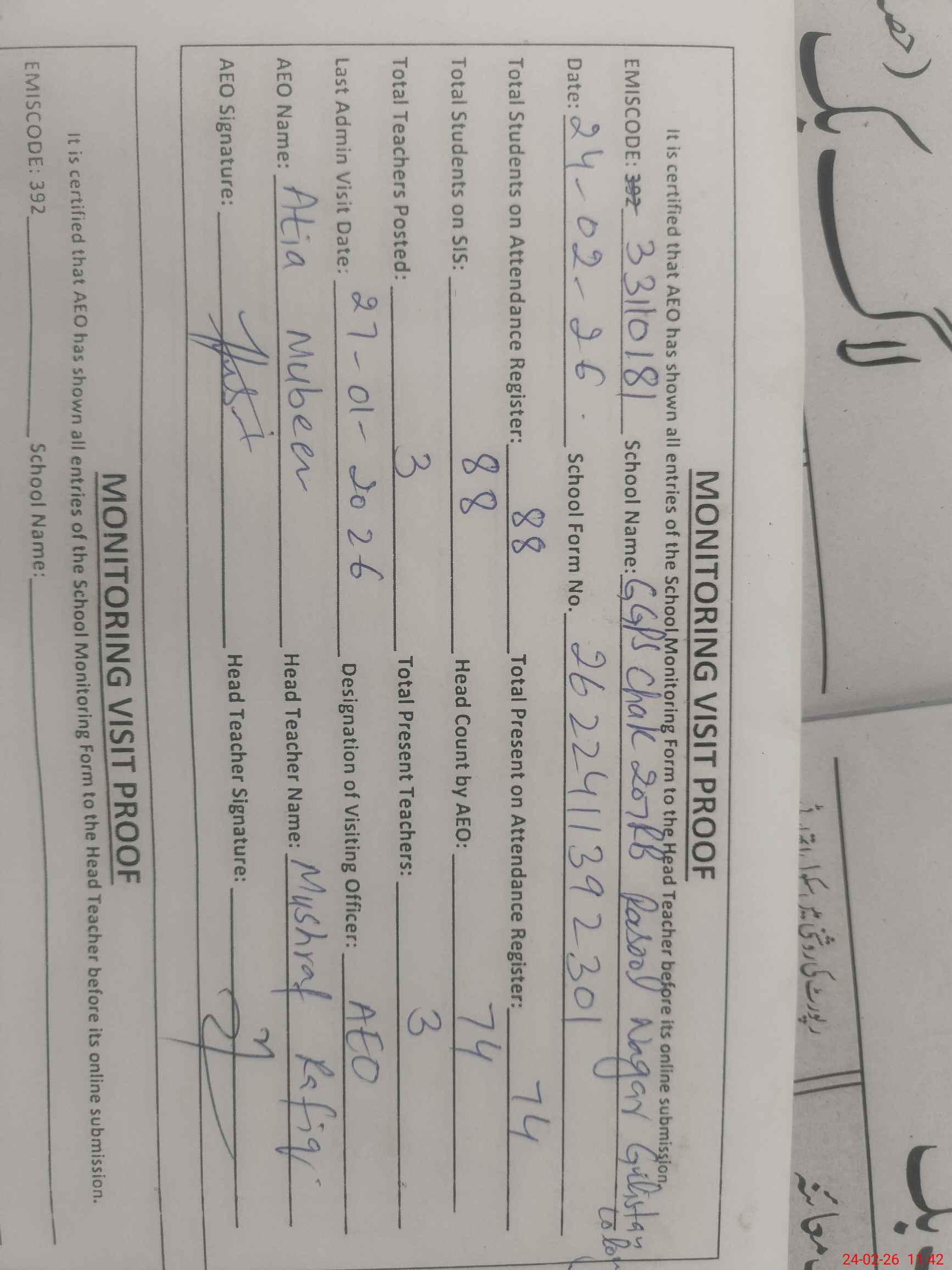 | Attendance Register | Head Teacher | MEA with School | Visit Proof |