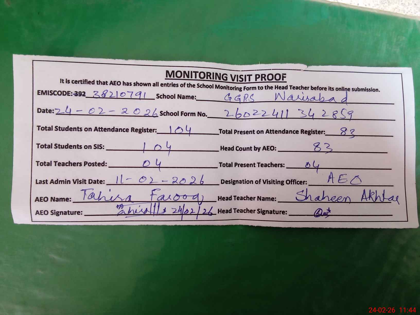 | Attendance Register | Head Teacher | MEA with School | Visit Proof |