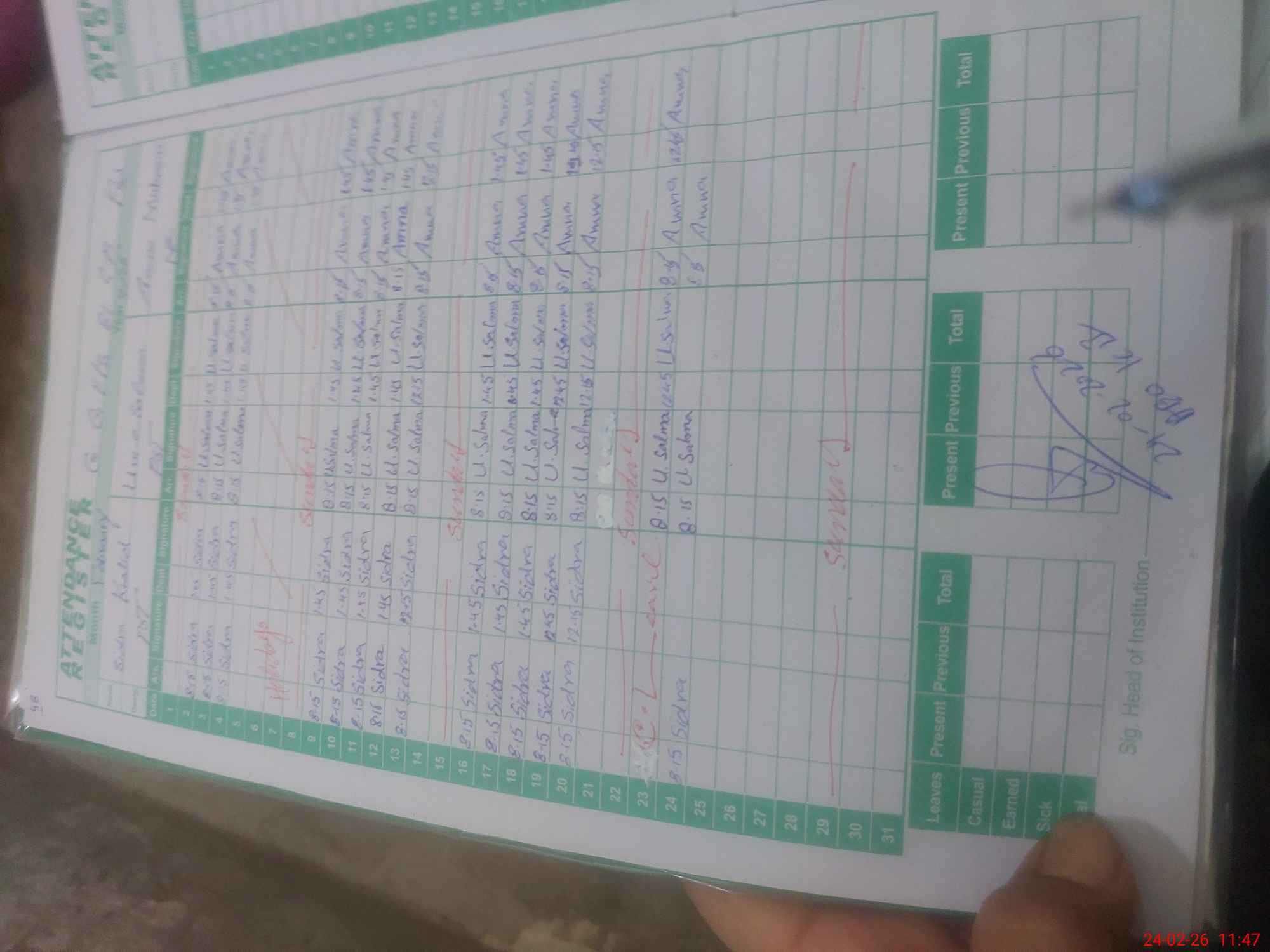 | Total Students Present | 0 | 0 | 30 | 34 | 35 | 35 | 24 | 14 | 14 | 21 | 250 | |||||