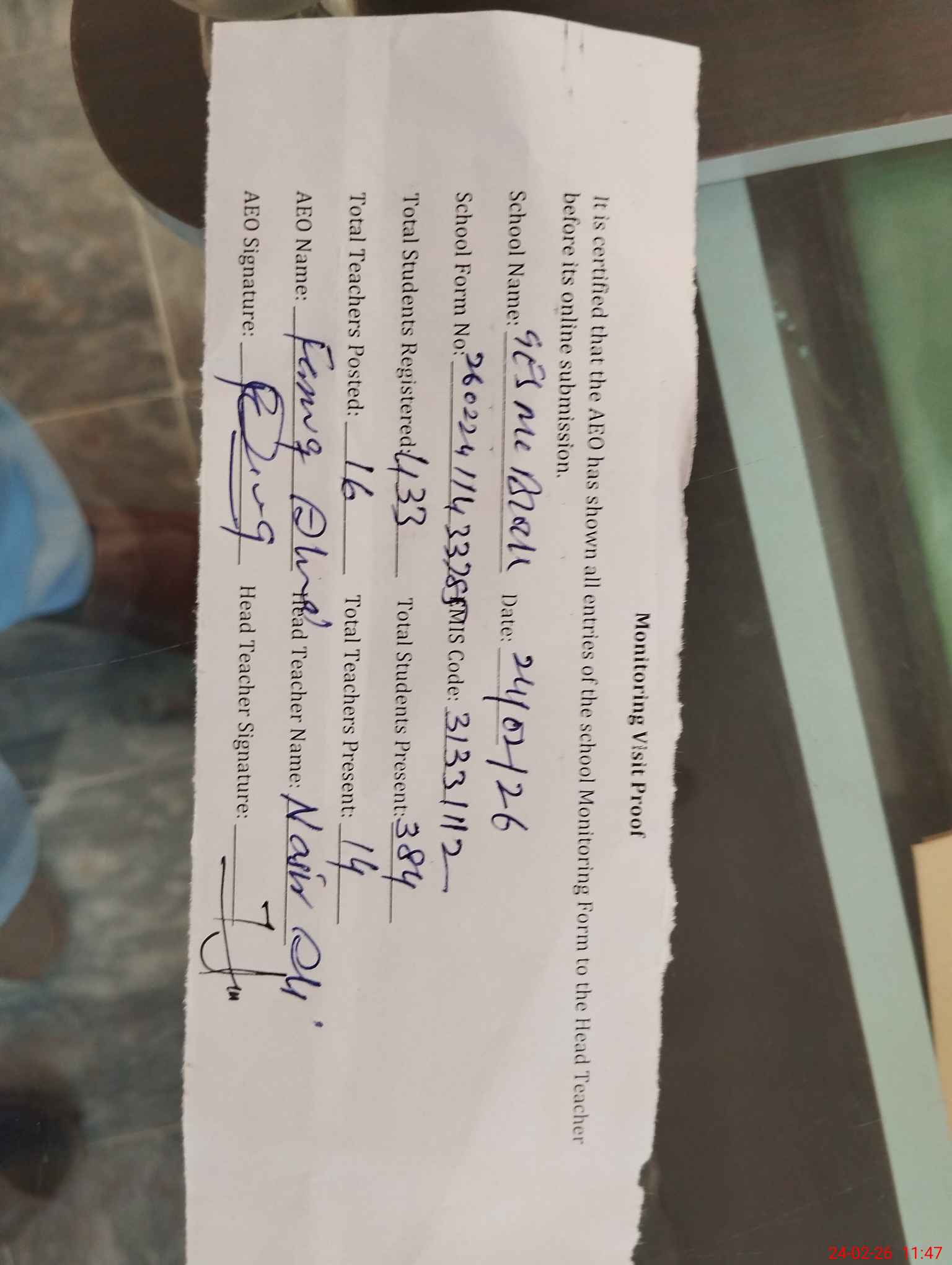 | Attendance Register | Head Teacher | MEA with School | Visit Proof |