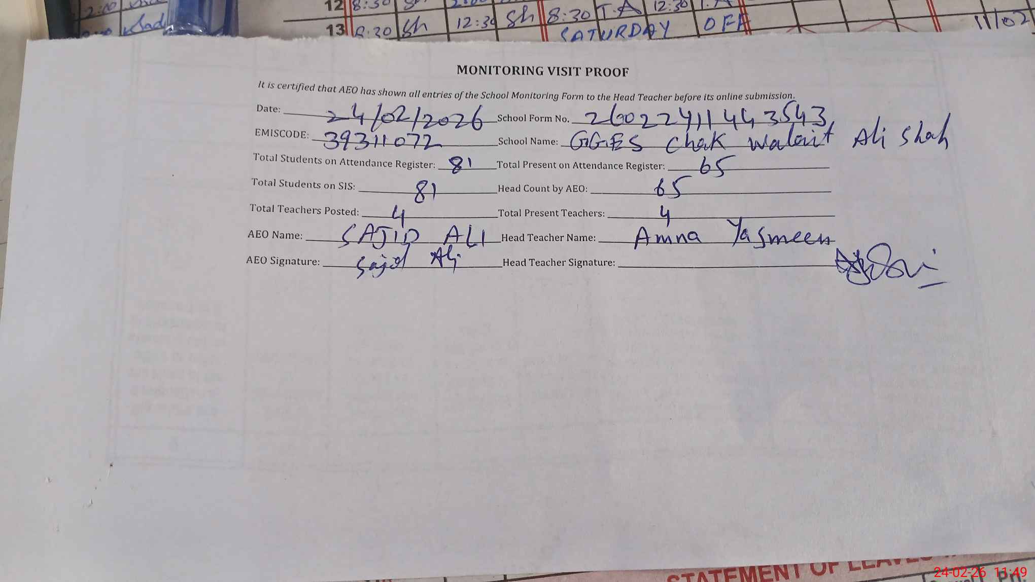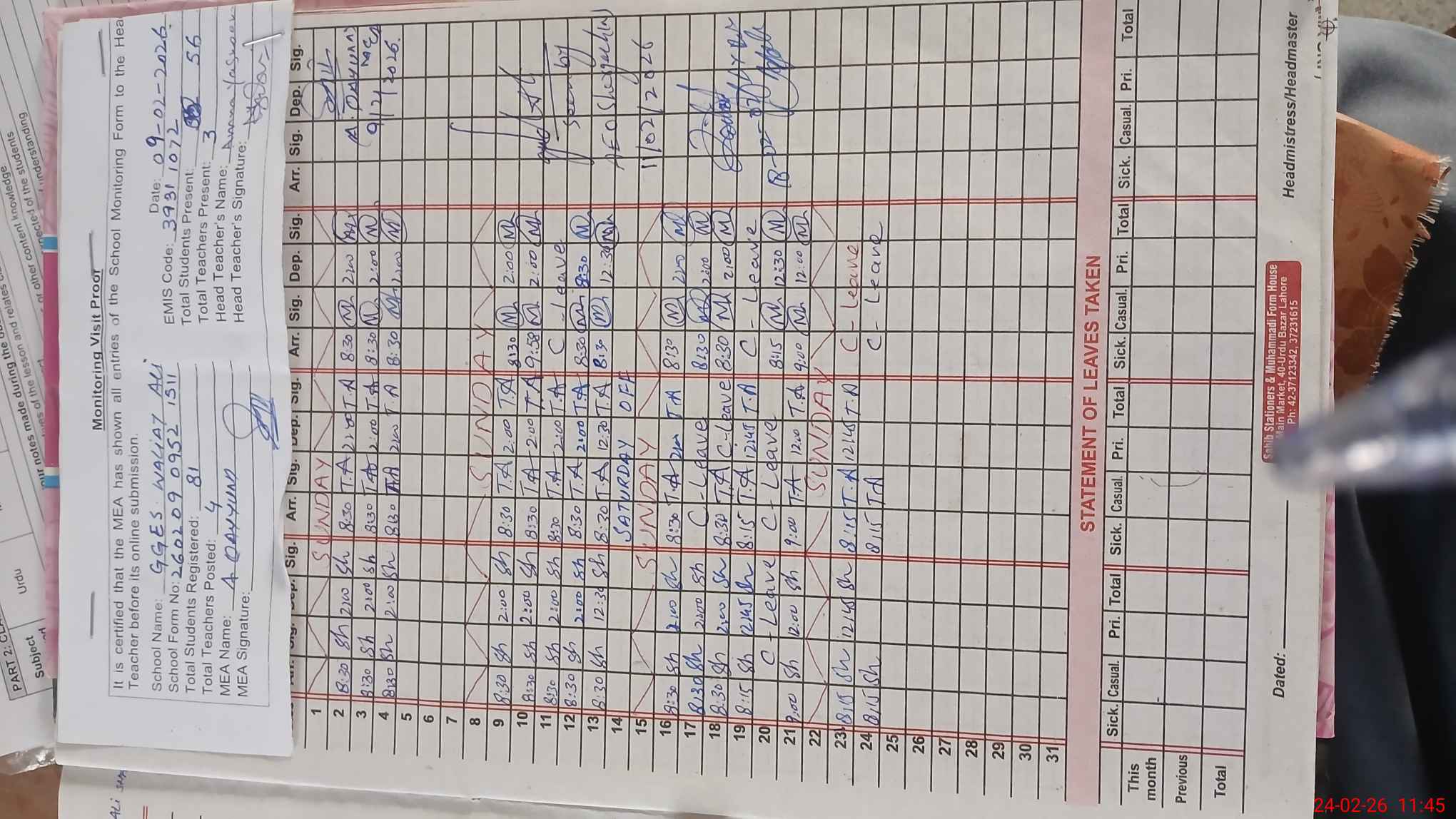 | Attendance Register | Head Teacher | MEA with School | Visit Proof |