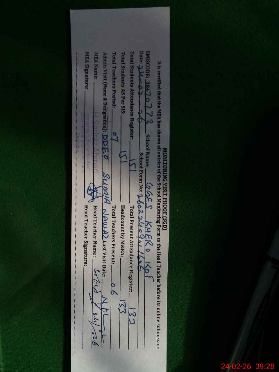 | Monitoring Date: 24-02-2026 | Start Time: 24-02-2026 09:01 AM | End Time: 24-02-2026 09:28 AM | Name of MEA: HA**** SA**** AH**** | |