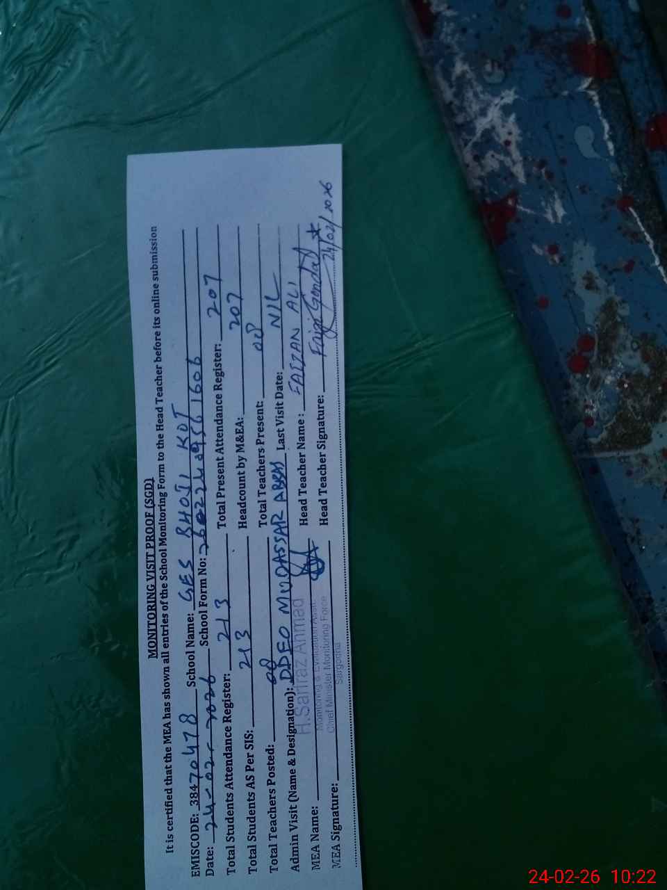 | Attendance Register | Head Teacher | MEA with School | Visit Proof |