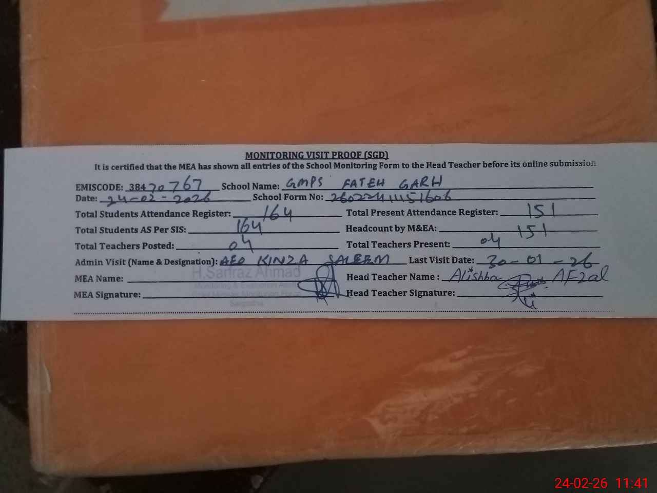 | Attendance Register | Head Teacher | MEA with School | Visit Proof |