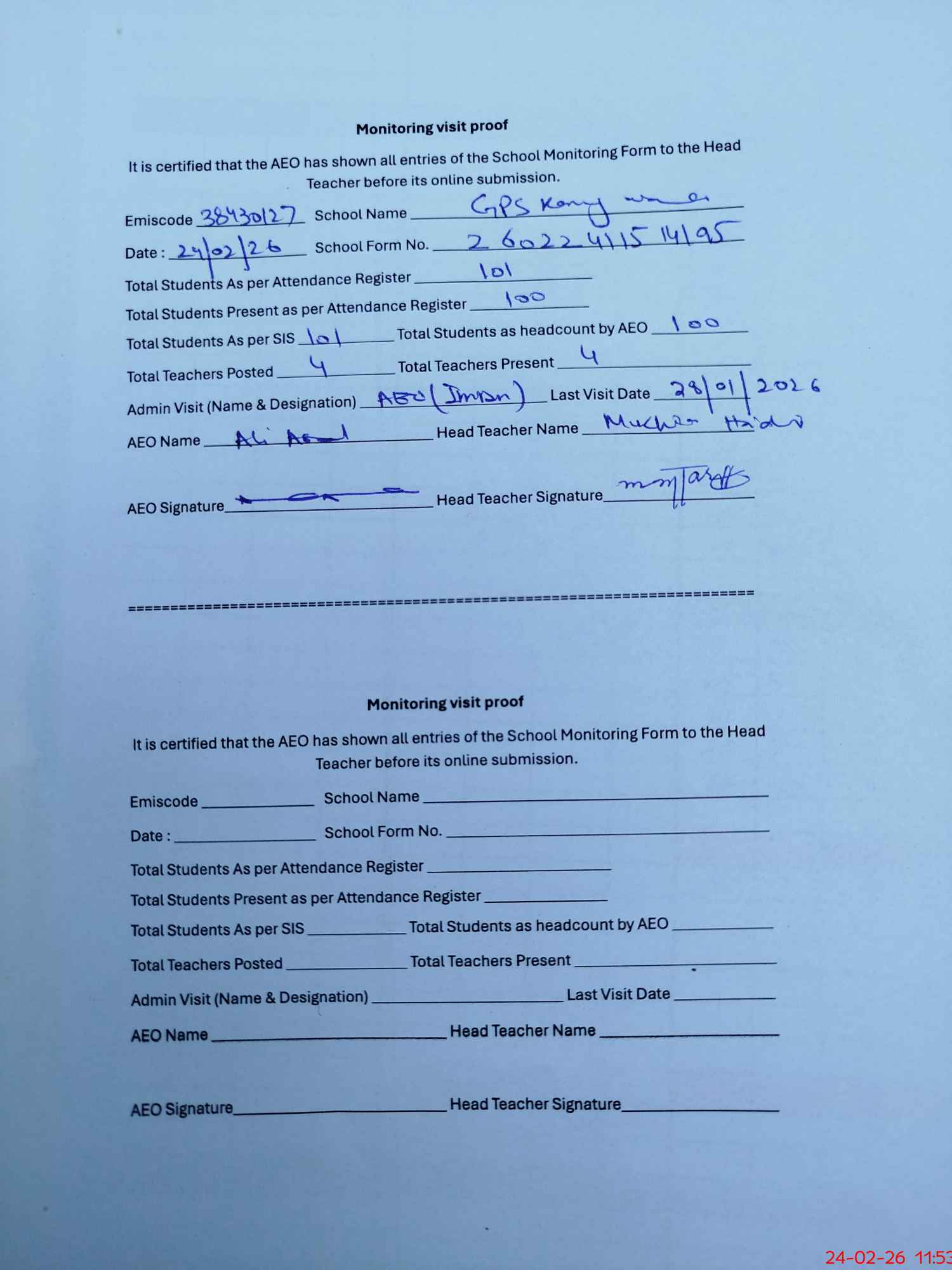 | Attendance Register | Head Teacher | MEA with School | Visit Proof |
