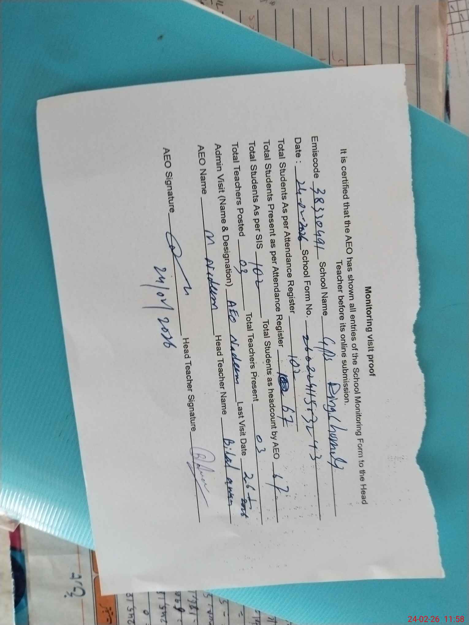 | Attendance Register | Head Teacher | MEA with School | Visit Proof |
