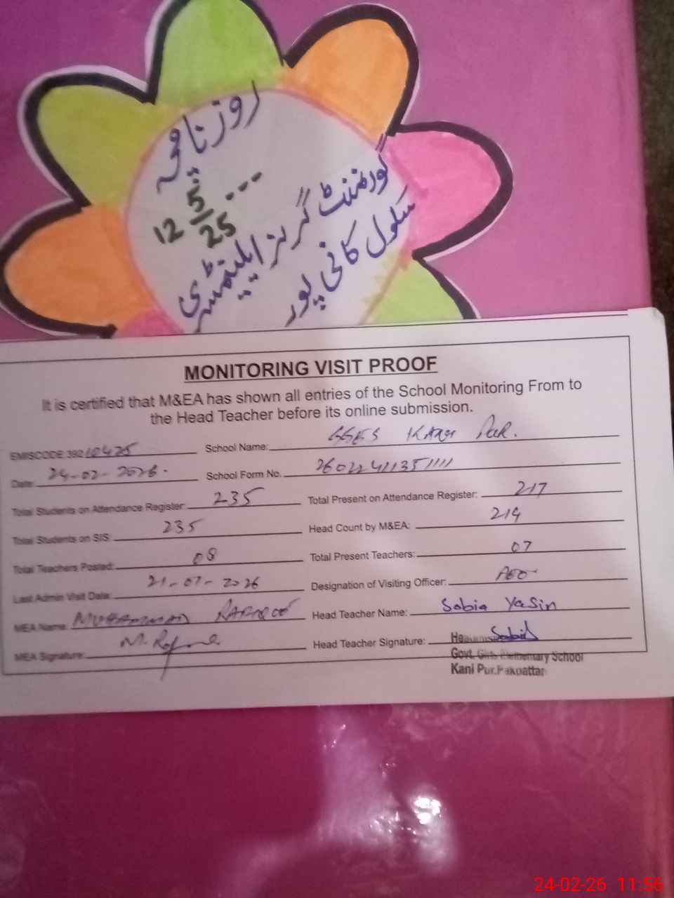| Attendance Register | Head Teacher | MEA with School | Visit Proof |