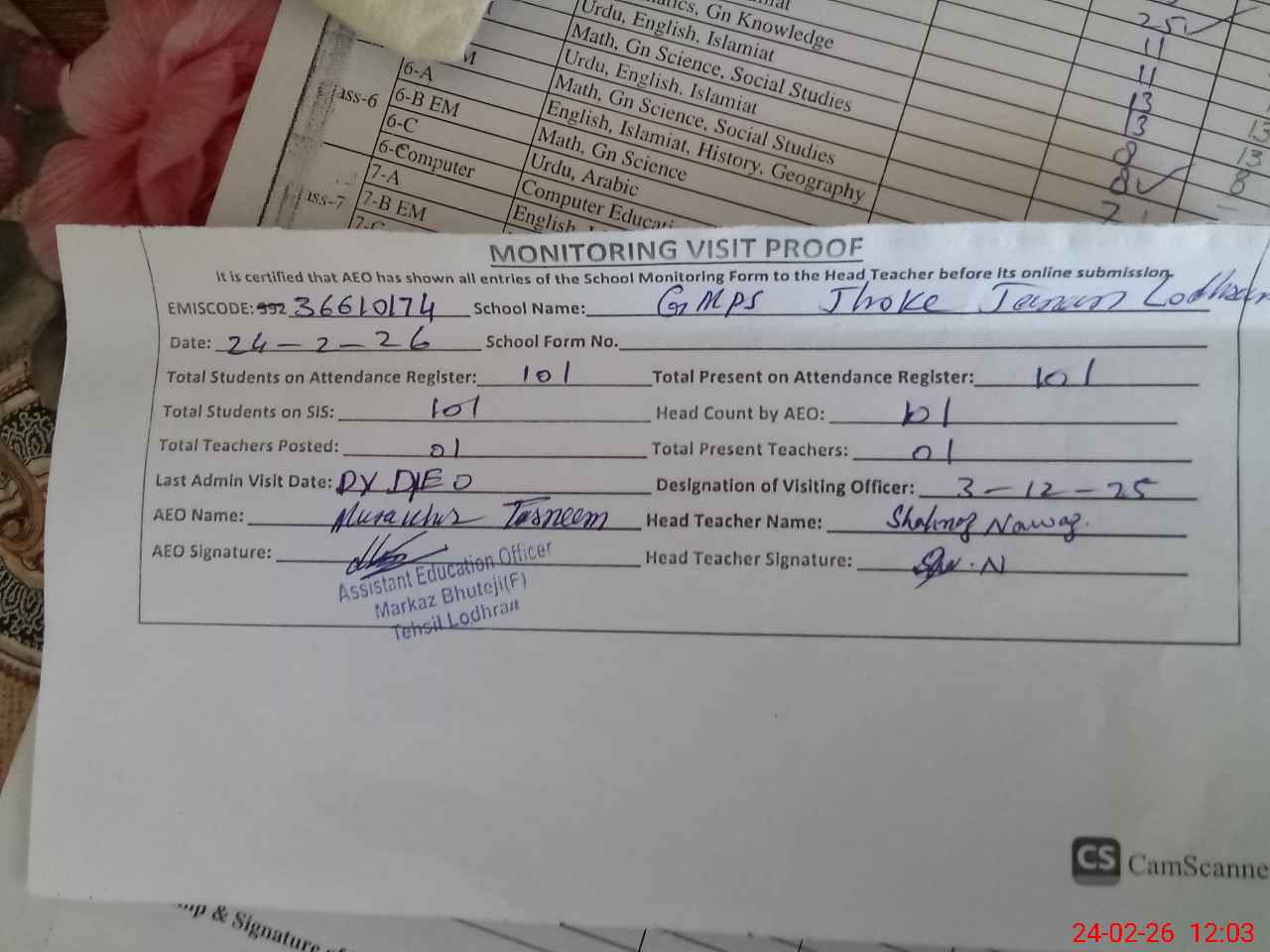 | Certified that this School was Inspected by the Undersigned MEA/DMO Today and the Information Stated Above is as Per Record. | |||||