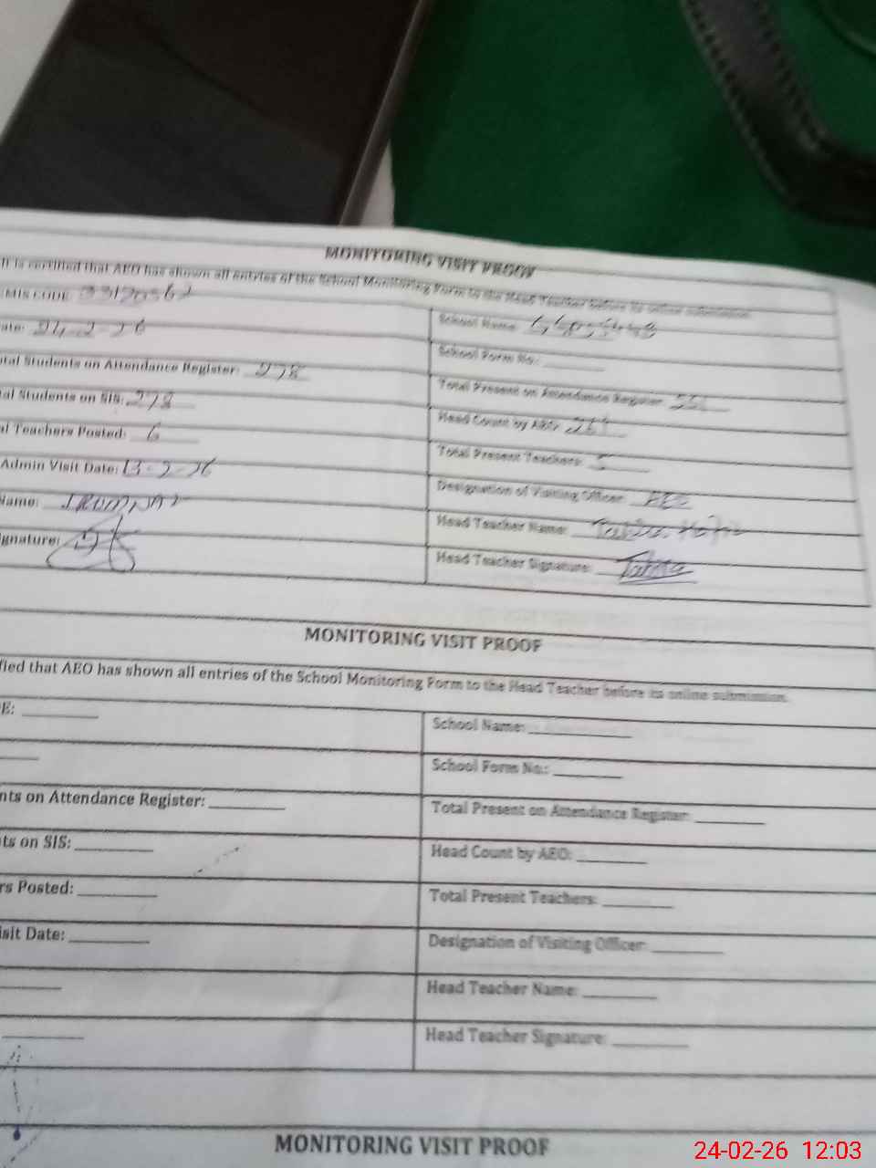 | Attendance Register | Head Teacher | MEA with School | Visit Proof |