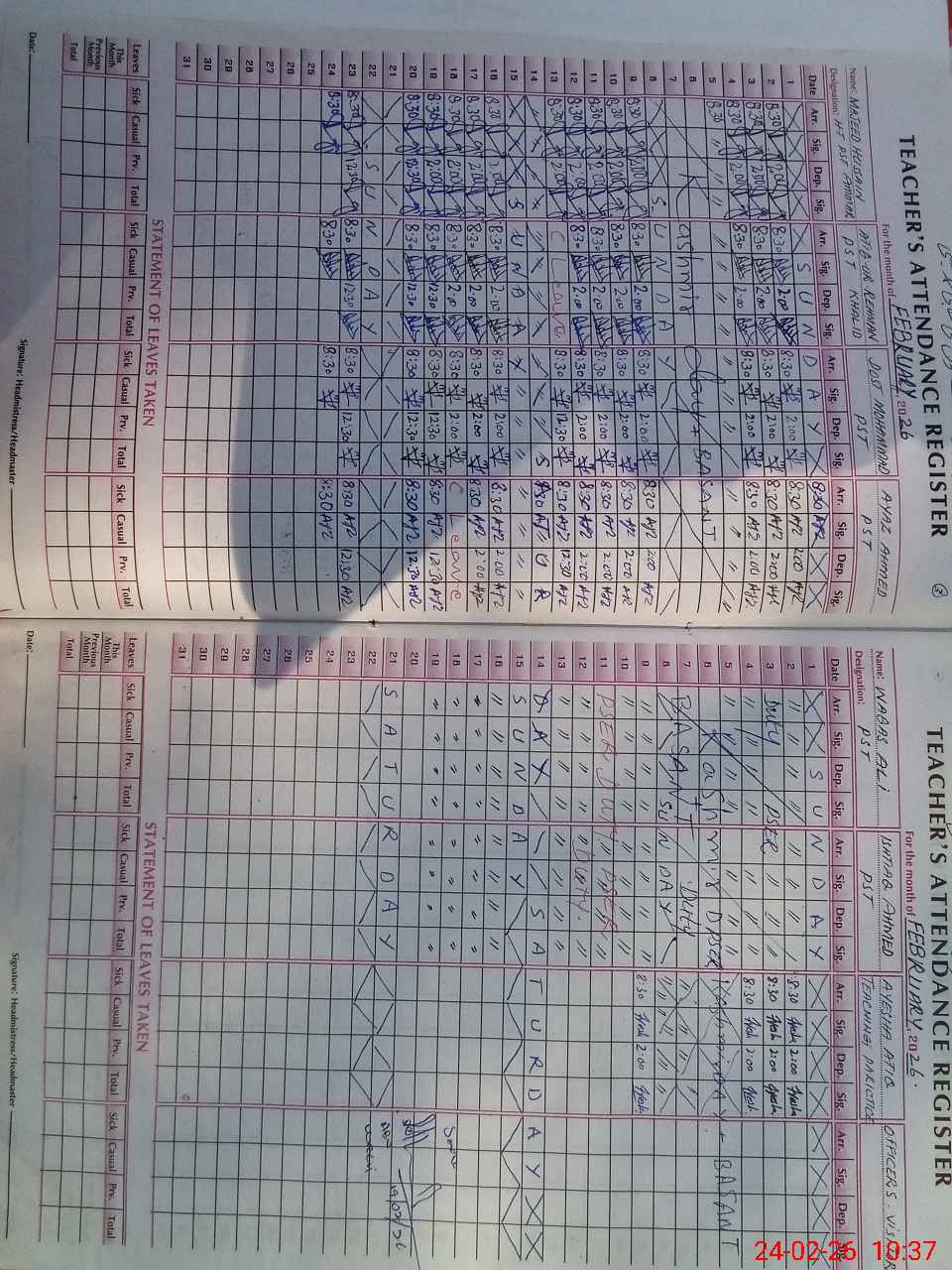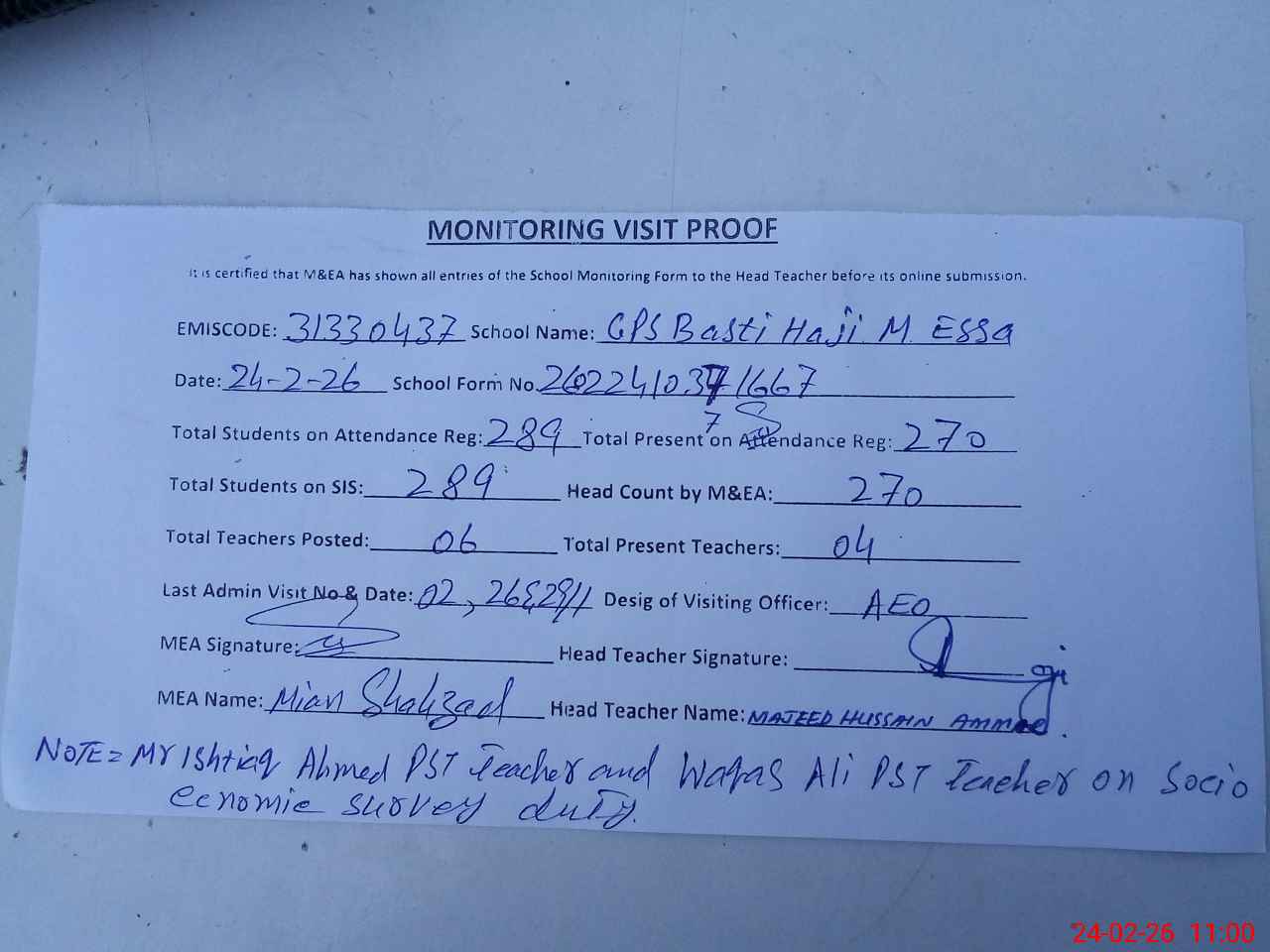 | Remarks (Use Separate Page if Required): Mr Ishtiaq Ahmed PST teacher and Waqas Ali PST teacher on socio economic survey duty | |||||