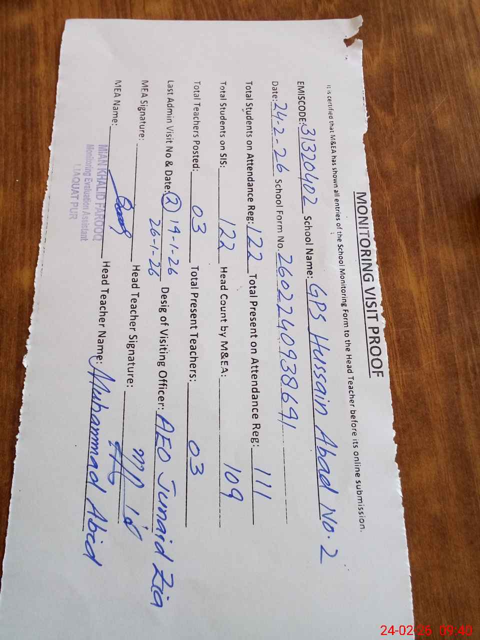 | Attendance Register | Head Teacher | MEA with School | Visit Proof |