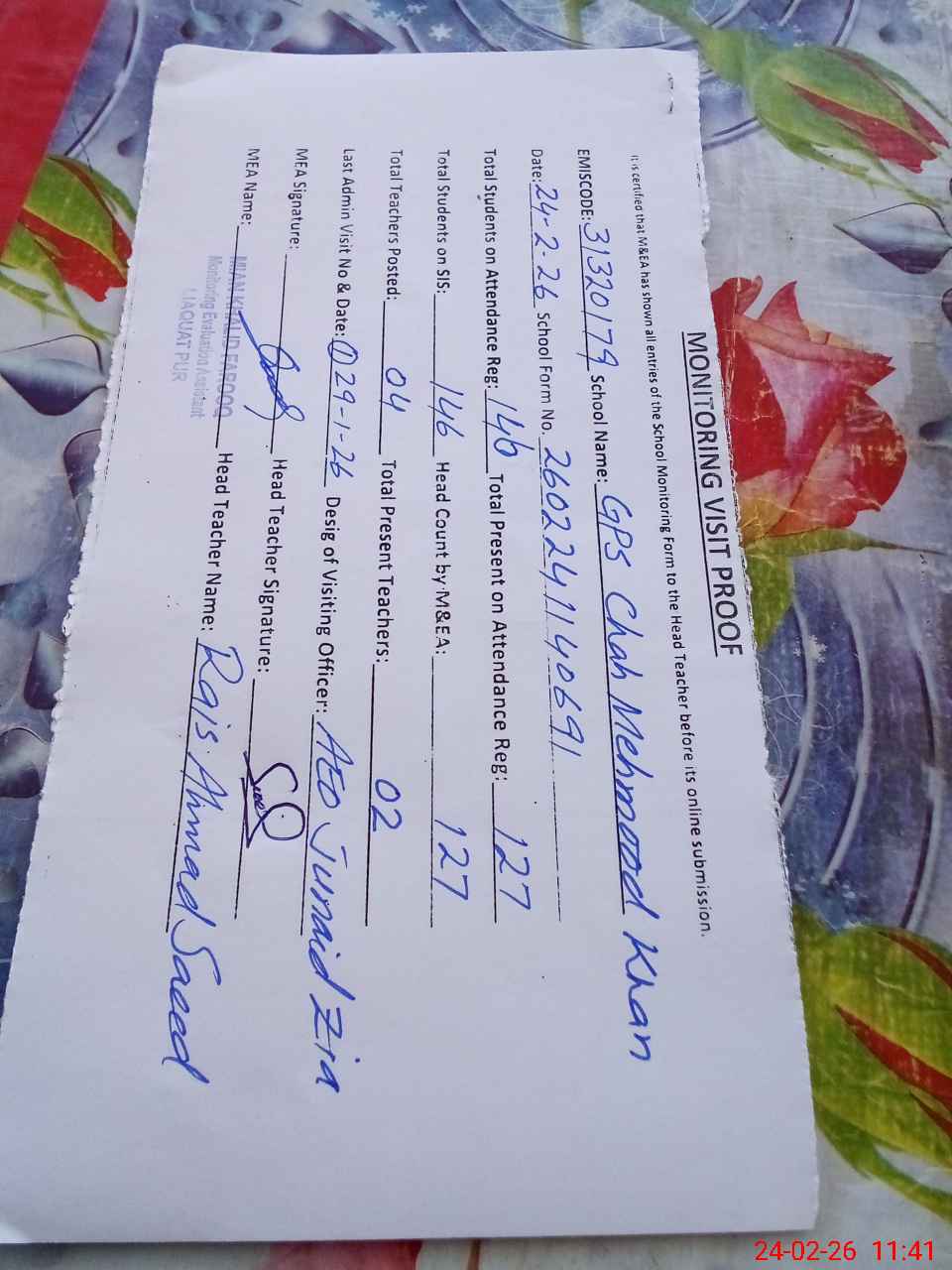| Attendance Register | Head Teacher | MEA with School | Visit Proof |