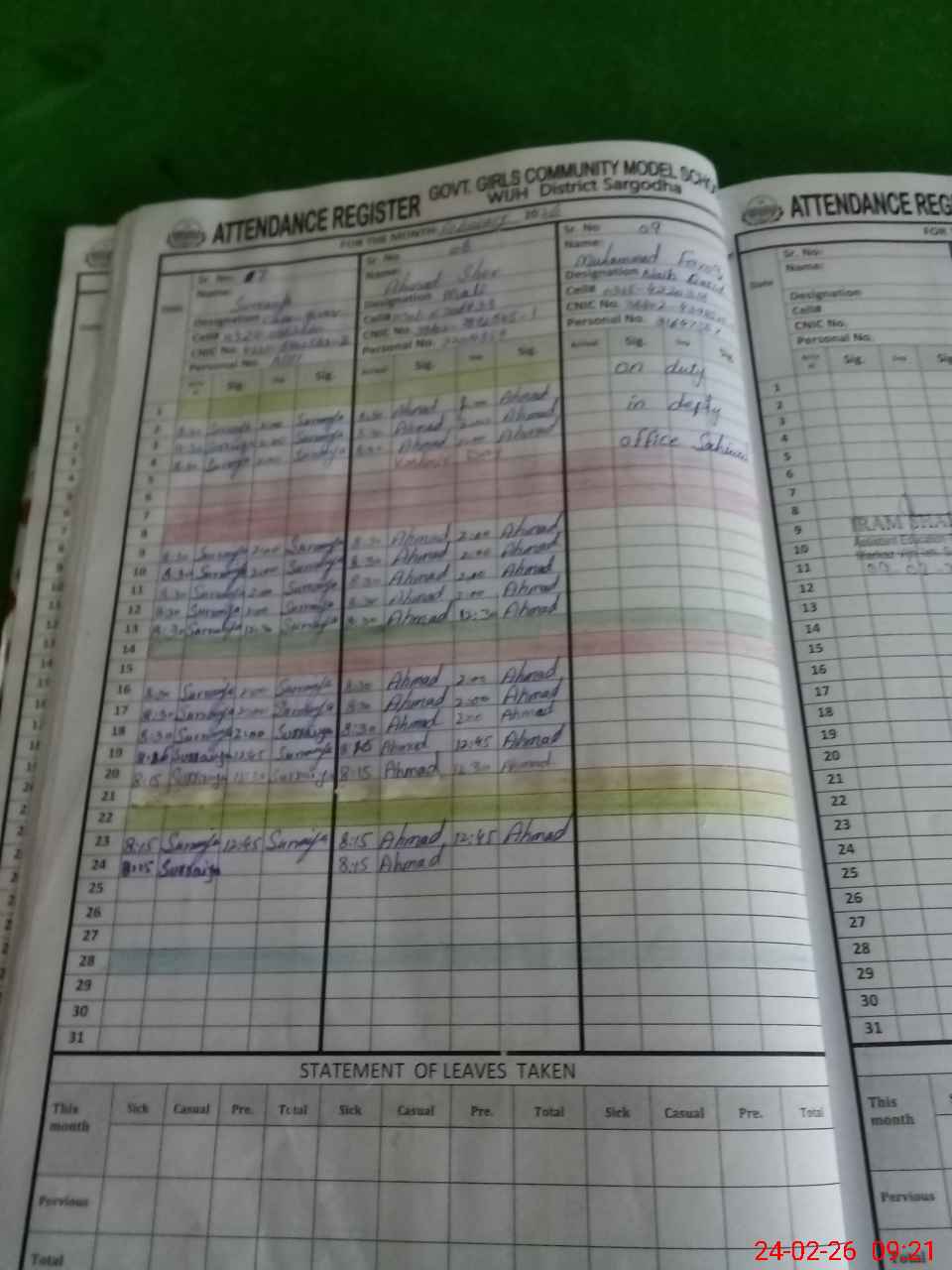 | CNIC | Full Name | Designation | R/C | Absence During Last Calender Month |