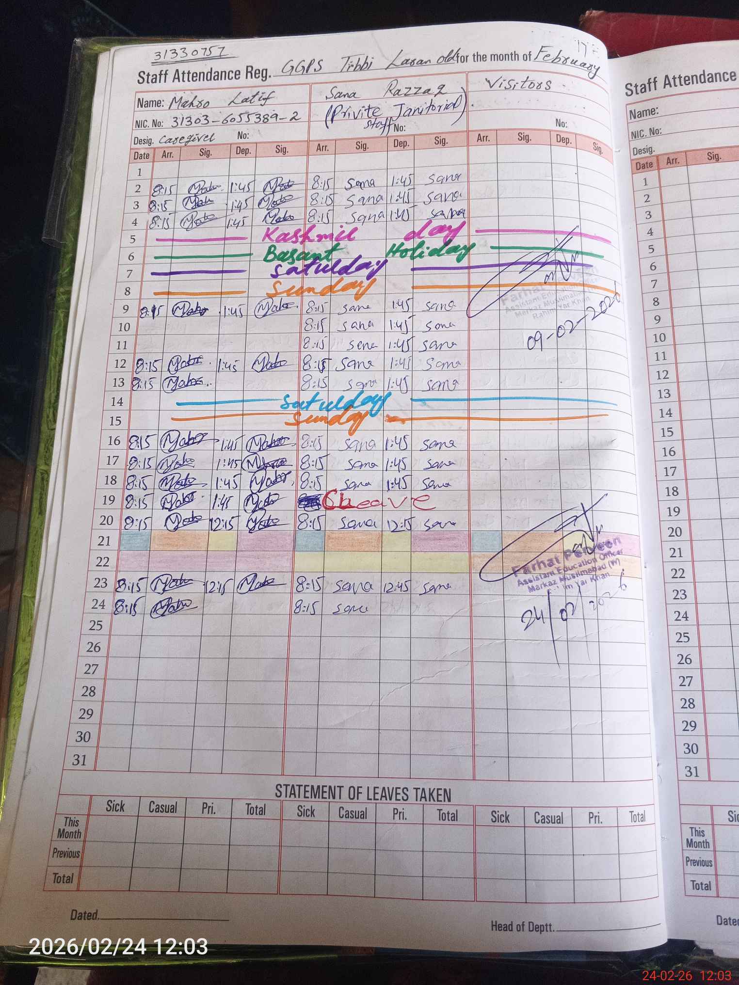 | CNIC | Full Name | Designation | R/C | Absence During Last Calender Month |