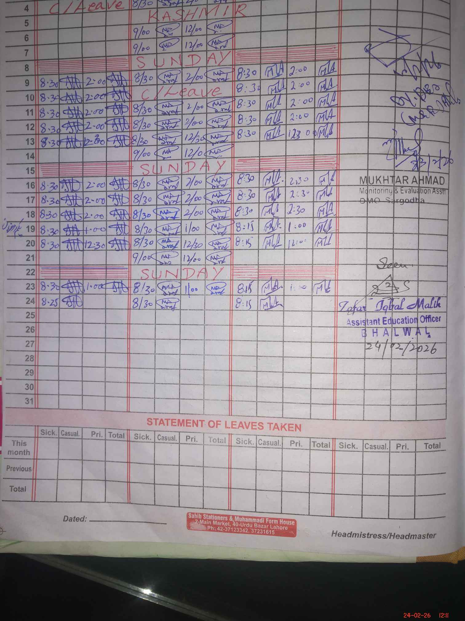 | Attendance Register | Head Teacher | MEA with School | Visit Proof |
