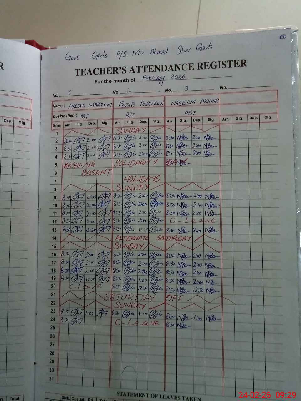 | Leave | Duty | Absent | Maternity | Medical | Ex- Pak |