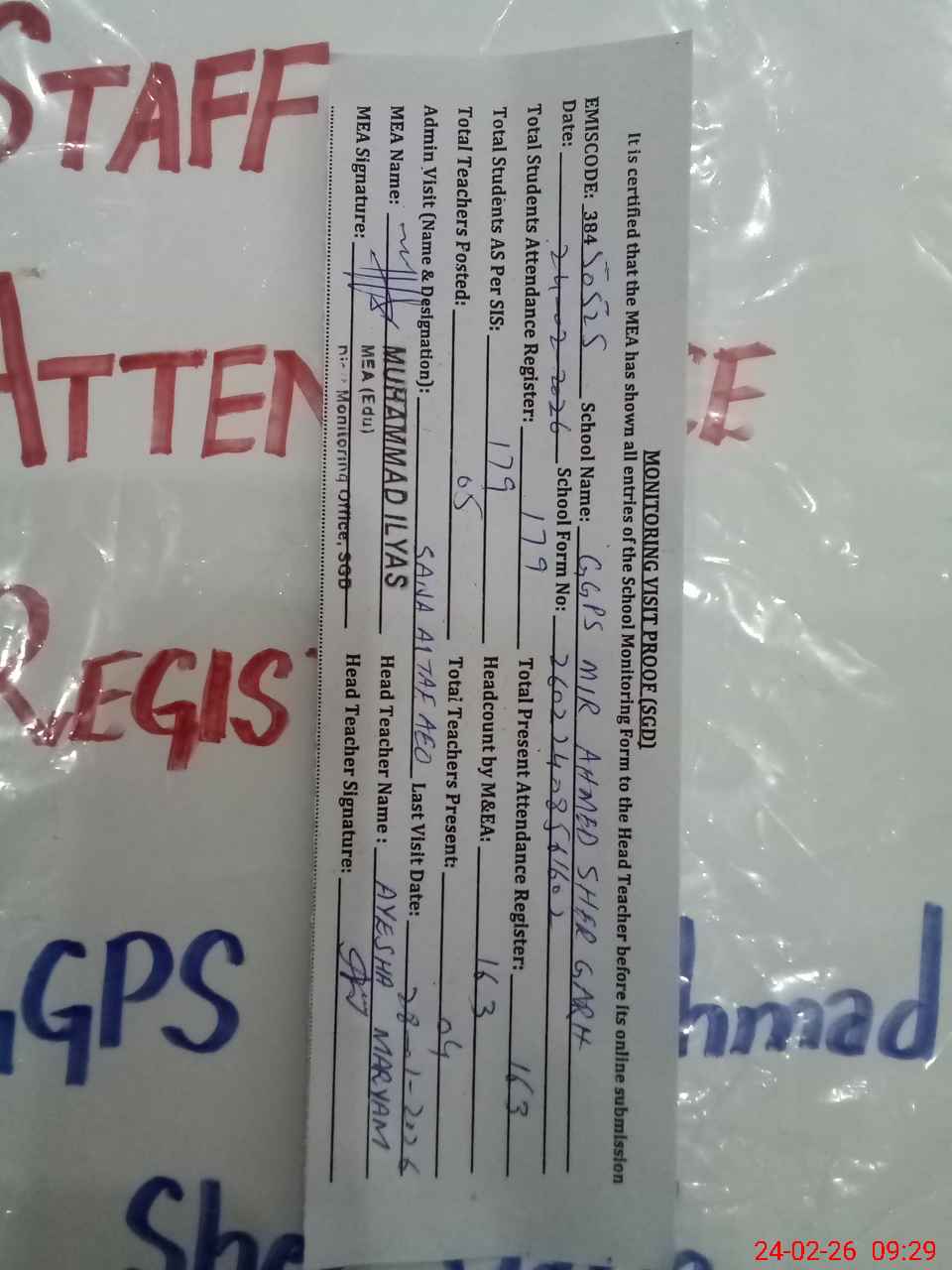 | Attendance Register | Head Teacher | MEA with School | Visit Proof |