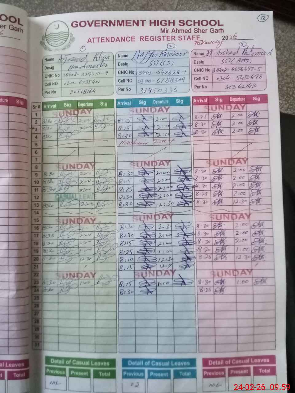 | CNIC | Full Name | Designation | R/C | Absence during last cal. month |