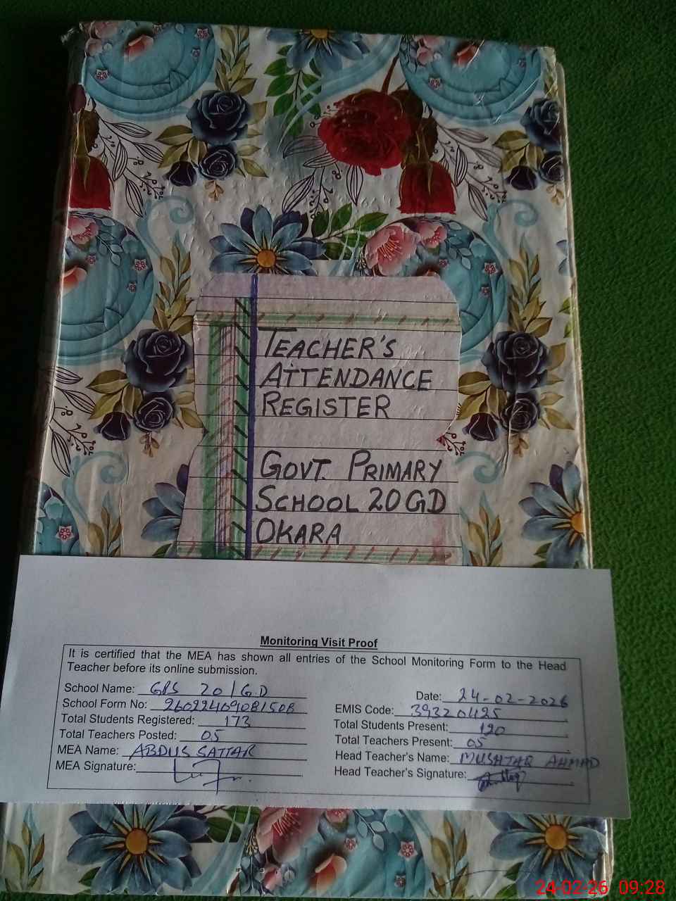 | Attendance Register | Head Teacher | MEA with School | Visit Proof |