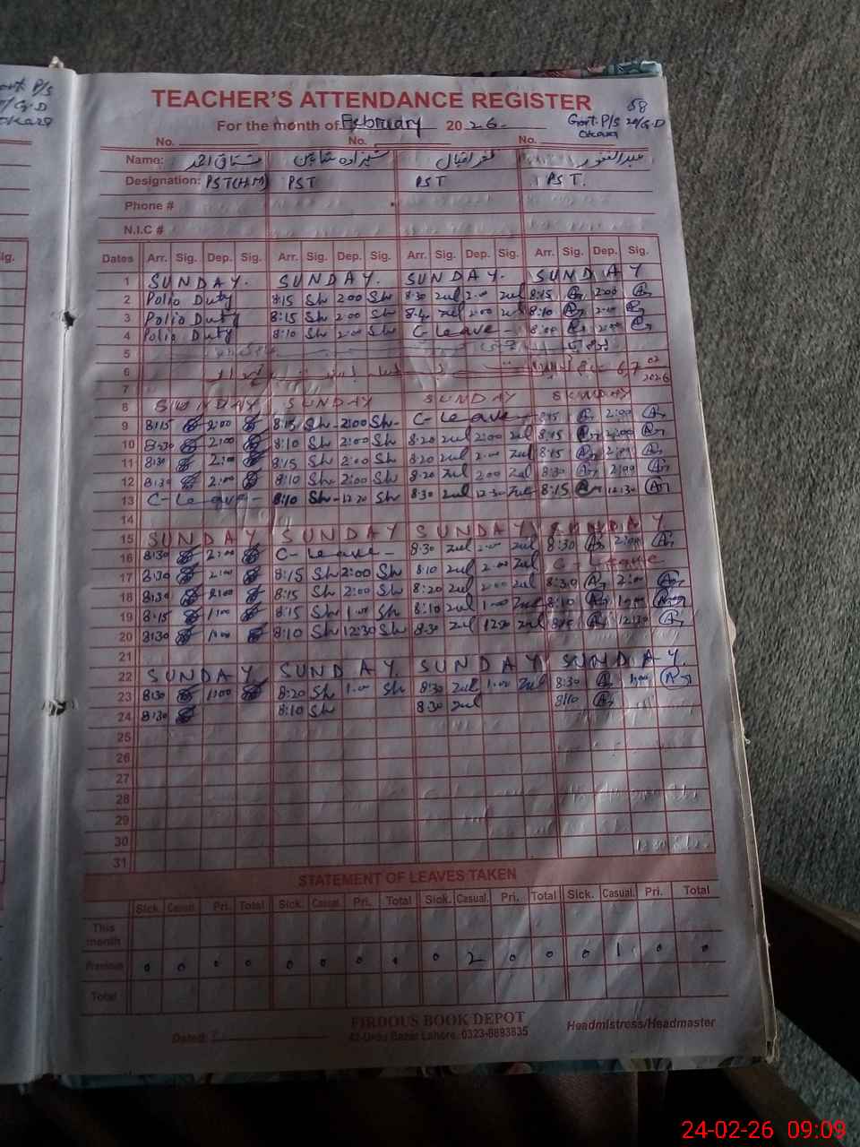 | Leave | Duty | Absent | Maternity | Medical | Ex- Pak |